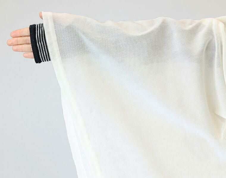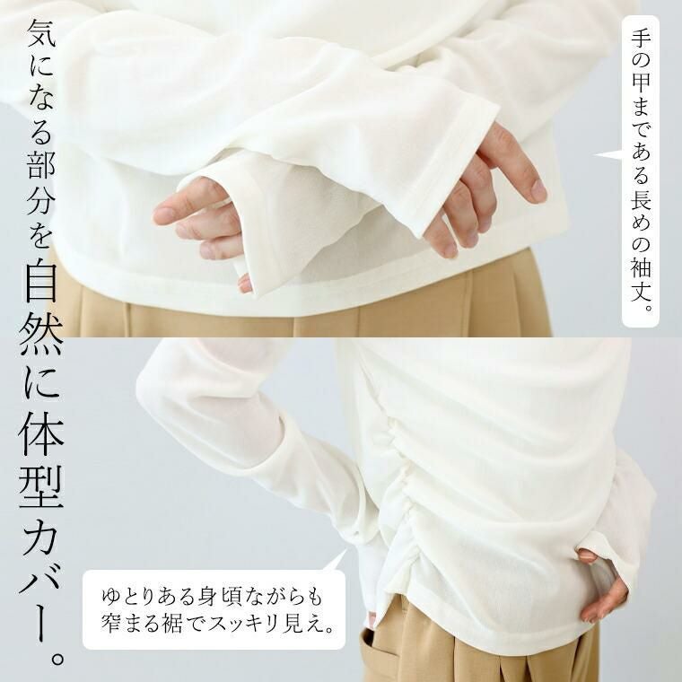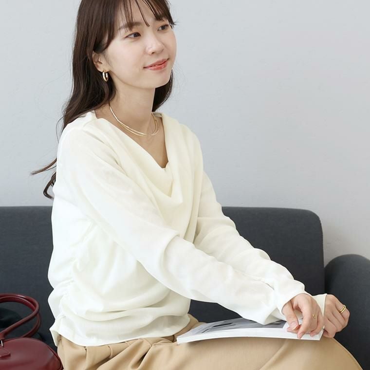 着丈はヒップにかかるくらい。袖丈は手首から20cm下。透け感のある生地ですが厚めなので秋にも活躍しそうです。サイドがシャーリングになっていてスッキリ見えます。