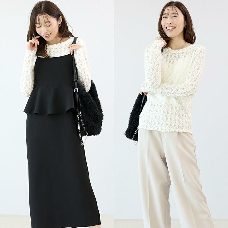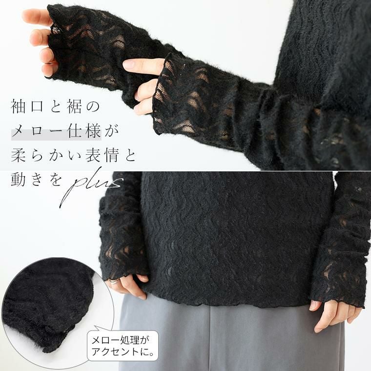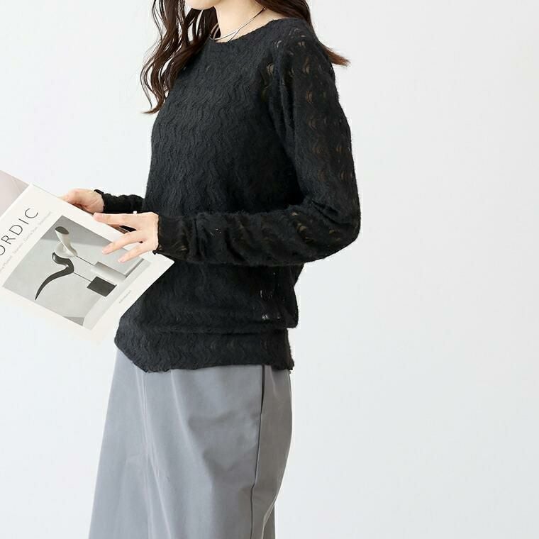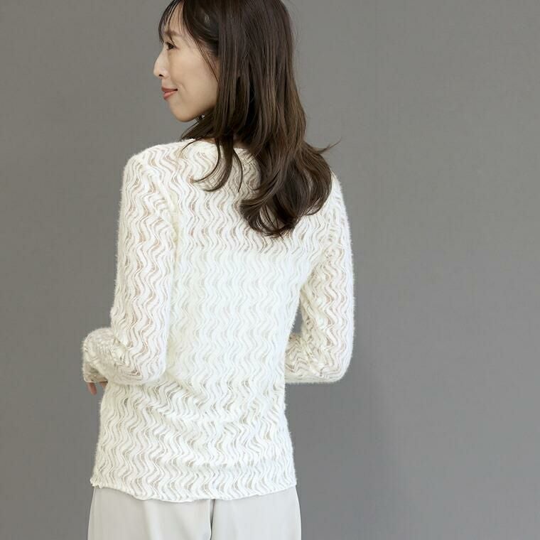 起毛のシアーレースで仕立てたプルオーバー。いつものカットソー感覚でコーディネートに取り入れるだけでトレンド感がにわかに高まります。ウェーブモチーフが描く曲線が女性らしい印象。表面変化のある起毛素材で季節感をアピール。伸縮する素材で着脱も楽。重ね着で使いやすいクルーネック。セットインの袖デザインと程よい身幅でシャープなスタイルに仕上がります。袖口と裾のメロー仕様が柔らかい表情と動きをプラス。季節の変わり目に重宝するアイテムです。