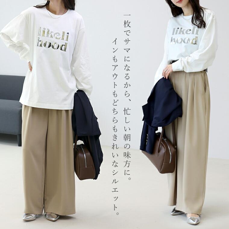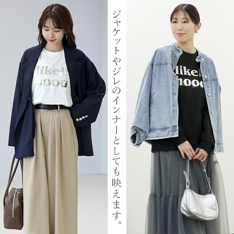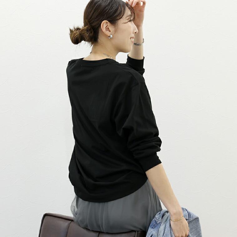 輝くシルバーのミラーロゴが特徴のカットソー。綿比率が高い天竺生地で、肌あたりは優しく、ポリエステル混で洗濯後も型崩れしにくいのが嬉しい。ベーシックなシルエットで着回し力抜群。ノーマルカットソーとして重ね着でも活躍します。ゆとりのある身幅でお腹まわりを自然にカバー。ヒップが隠れる長め丈で安心感のあるシルエットで、体のラインを拾いにくい絶妙なサイズ感です。クルーネックで首元すっきり、清潔感のある印象。袖口リブでたくし上げても落ちにくく実用性に長け、袖を上げるとほんのり袖が膨らみ腕周りをカバーし女性らしい印象に。「likelihood=前向きな変化」を意味する、カジュアルすぎない大人仕様のロゴデザイン。ジャケットやジレのインナーとしても映えます。1枚でもサマになるから忙しい朝の味方になります。パンツにもスカートにも合わせやすい汎用性の高さも魅力。ロングシーズン着られる素材感。季節の変わり目にも重宝します。大人の毎日にちょうどいい「着映え」と「ラクさ」を両立する1枚です。