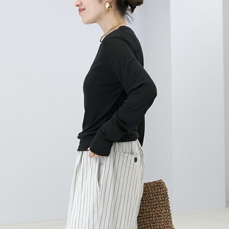 極薄で軽やかな着心地が魅力のシアーフライスプルオーバー。ポリエステルにレーヨンを織り込んだやわらかな素材で、なめらかな肌触りと高い伸縮性を実現しました。浅めの横広ボートネックが顔まわりをすっきり見せ、アクセサリーも映えるデザイン。両サイドの裾ゴムが自然に腰位置を高く見せ、気になるウエスト周りもさりげなくカバーします。薄手で重ね着しても着膨れしにくく、一枚でもインナーでも活躍。軽さと着回し力を兼ね備えた、大人のデイリーコーデに頼れるカットソーです。