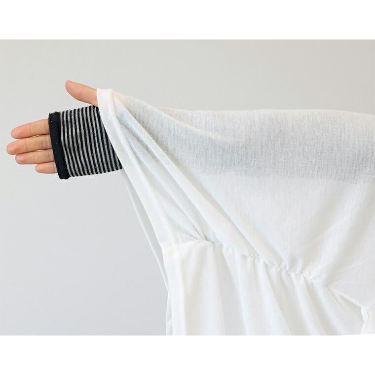 着丈はヒップの上くらい。袖丈は手首から24cm下。程よいフィット感でスッキリ見え、伸縮性もあるので窮屈さは感じません。ギャザーが入っていて綺麗なシルエットに見せてくれます。着丈は短めでハイウエストのパンツやスカートに合いそうです。