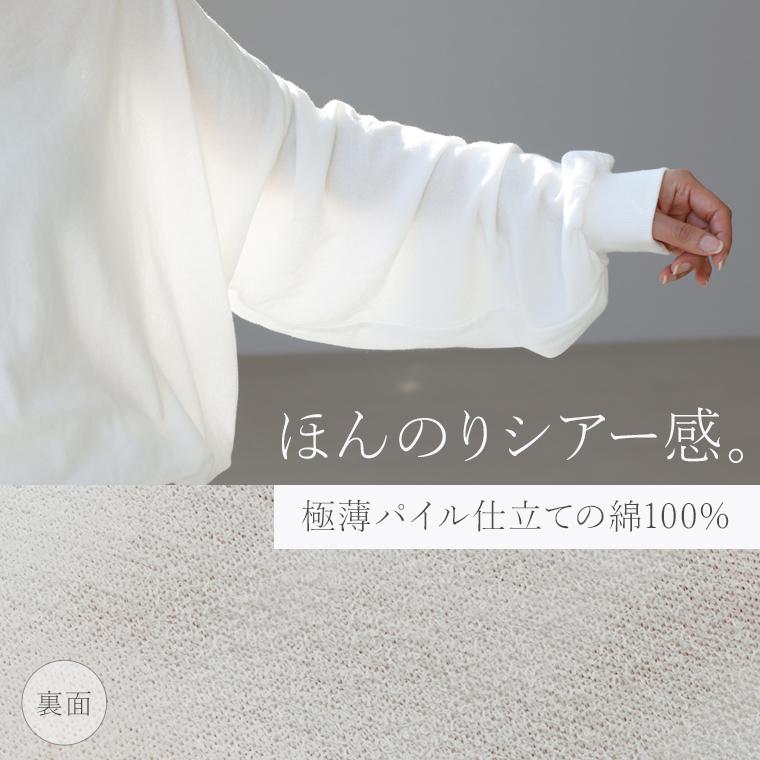 繊細な細番手コットンに、極薄パイルならではのやわらかな表情を重ねたプルオーバー。ゆったりとしたシルエットと、計算されたディテールで力を抜いても、だらしなく見えません。ガーゼのような細番手コットンで、空気をまとう軽さと薄さが魅力、極薄パイル仕立てで、ほんのりシアーな綿100%素材です。襟ぐりは程よい開きのクルーネック。ワイドな身幅で身体のラインを拾いにくく、ドロップショルダーが自然な抜け感を演出します。襟、袖口、裾のリブ部分にはストレッチ素材を編み込み、快適なフィット感。何気ないのに、洗練されたおしゃれを叶える一枚です。