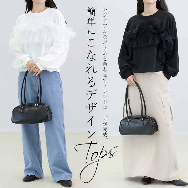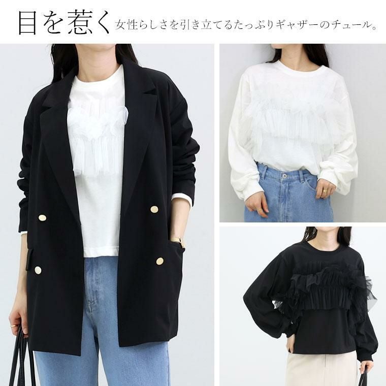 ラクなのにお洒落見えするデザイントップス。本体はTシャツ素材で気負いなしの着用感です。ボリューム感抜群のたっぷりギャザーのチュールが甘めなアクセント。チュールの透け感が上品で甘さとカジュアルさが絶妙バランスです。シンプルなボトムに合わせるだけでトレンド感満点な仕上がりに。スタイリングが簡単に決まる頼れるトップスです。