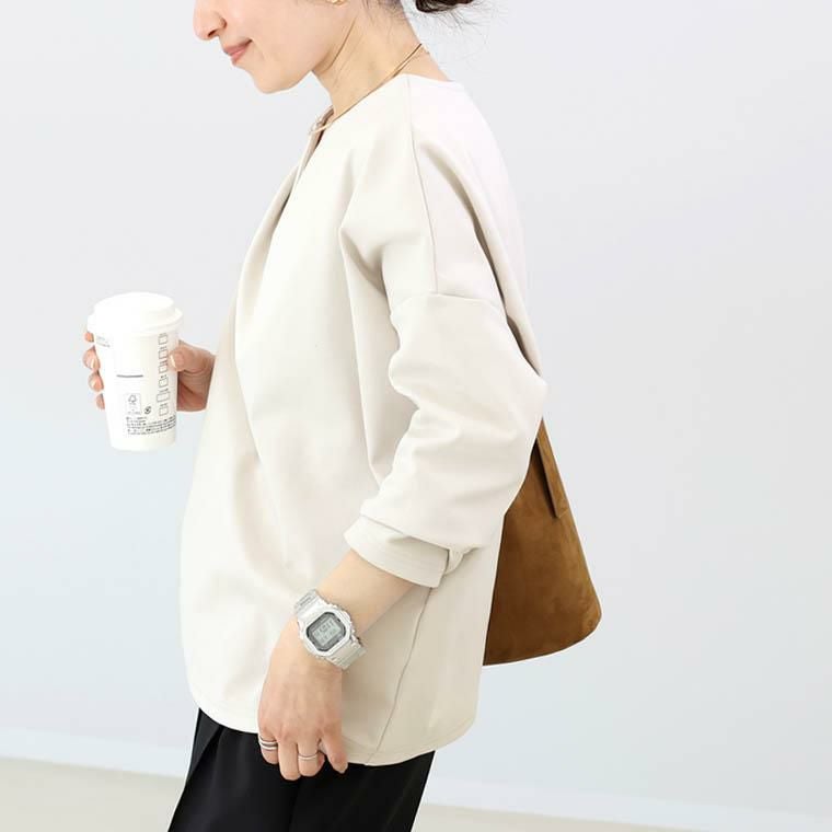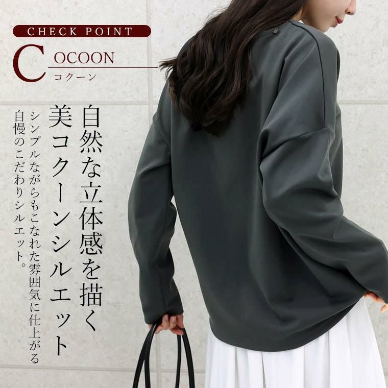 着やすさときちんと感を両立できる、定評のあるポンチ生地で仕立てたプルオーバー。着るだけで立体シルエットが完成する人気のコクーンデザイン。ドルマンで身幅にゆとりを持たせつつ、裾に向かってほんのり窄まる計算されたラインがボトムに重ねるだけで美バランスに。襟元は顔周りをすっきりみせるスリットネックで大人の抜け感を。インナーを気にせず着られるほどよい肌見せで安心して着られるよう設定しました。しっかりとした生地感できちんと見え。カジュアルにもきれいめにも対応した大人の女性にお薦めの一着です。