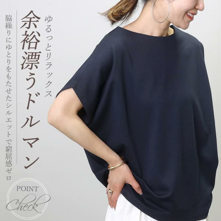 ややしっかりとしたポンチ生地で仕立てたドルマントップス。生地のもつほどよいハリがボディラインを拾わず、着るだけで立体シルエットをキープしてくれる為、体への張り付きも抑えストレスのない着心地を叶えます。ゆとりのあるドルマンシルエットは、体型カバーにも◎身幅には十分に余裕をもたせ、裾に向かってほんのりシェイプされるコクーンラインがシルエットにメリハリをプラス。ストンと着るだけで腰の位置で自然にとまってくれるので着こなしもとっても楽々。シンプルなのにいつものコーデに差がつく、大人の為の立体トップス。