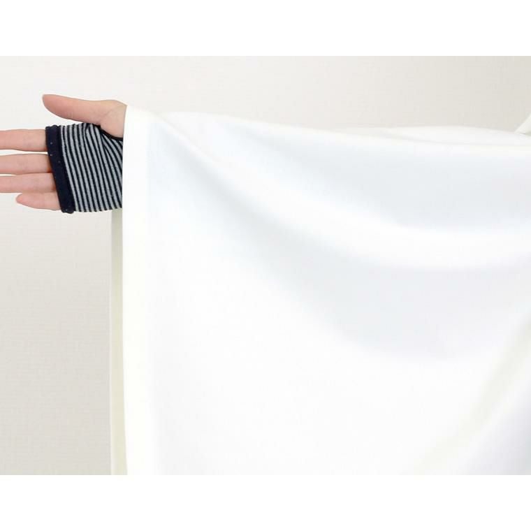 着丈はヒップが3分の2隠れるくらい。袖丈は肘から10cm上。しっかりした生地で、伸縮性もあります。体にフィットしないシルエットで、体型カバーに◎。腕を上下に動かしても突っ張りません。