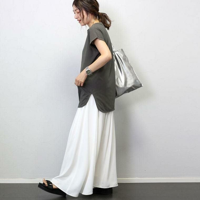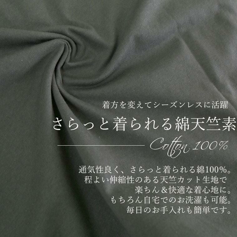 着丈はヒップから4cm下。袖丈は肩から10cm下。しっかり着丈があり、足の付け根くらいまで隠れます。全体的にゆったりしていて、夏でも肌に張り付かず快適に着れそうです。