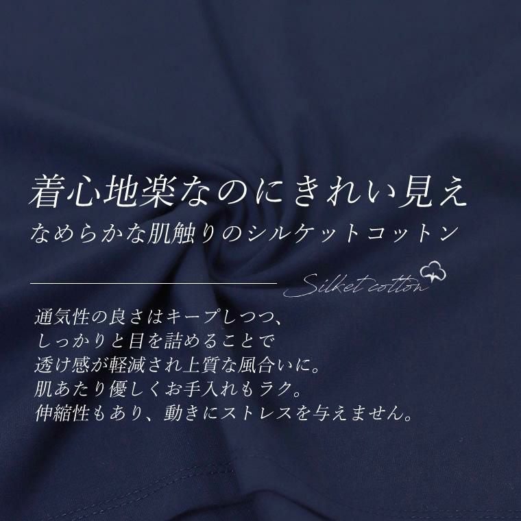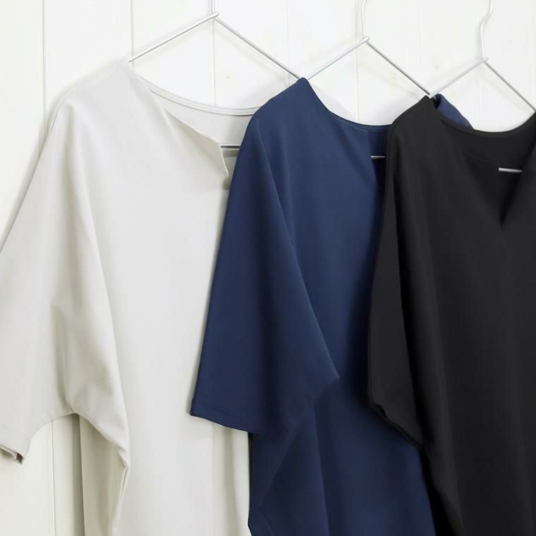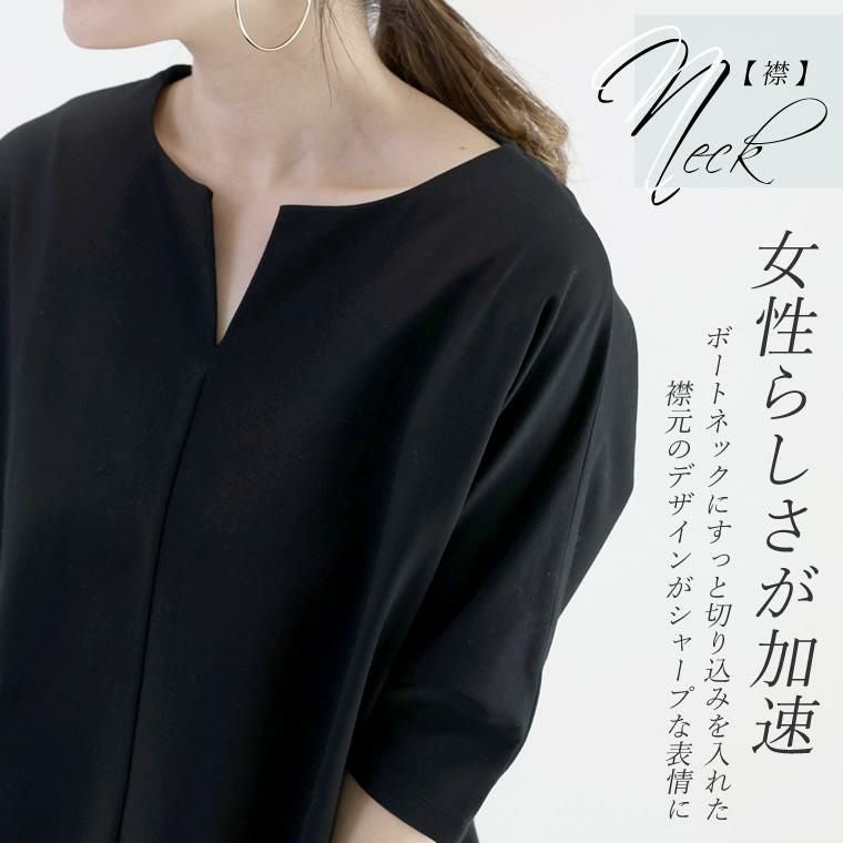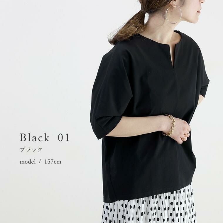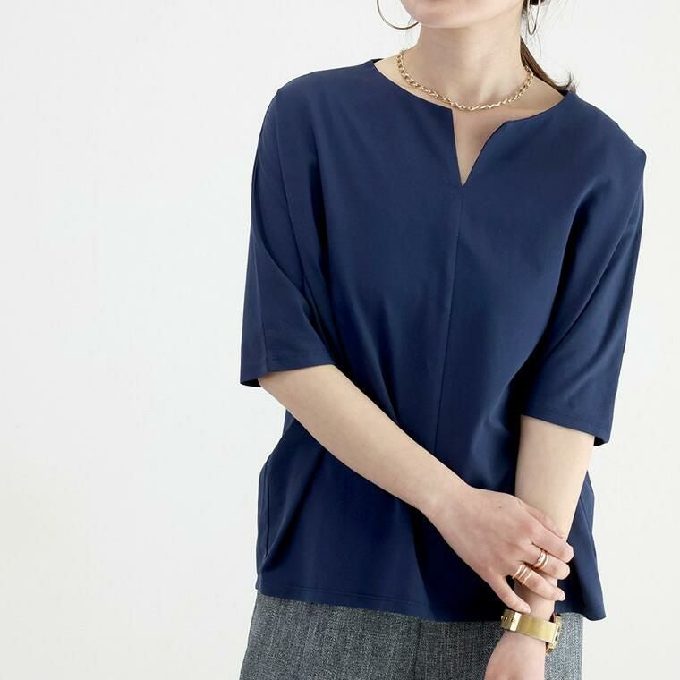 キーネックシルケットコットンドルマンプルオーバー リラックスときれいの共存、大人の欲しいが詰まった優秀カットソーの登場です。 体が泳ぐドルマンスリーブが、ボディーラインを上手にカモフラージュ。 ゆとりがあるので着心地も楽ちん。二の腕をすっぽり包む長めの5分袖丈も嬉しい。 さらに肩の切替をなくすことで、より女性らしい華奢なシルエットを描きます。 素材には肌あたりなめらかなシルケットコットンを採用。通気性の良さは キープしつつ、しっかりと目を詰めることで透け感を軽減し上質な風合いを実現しました。 旬のキーネックや前後差、大人の女性を上品かつ美しくみせるこだわりの詰まった一着です。