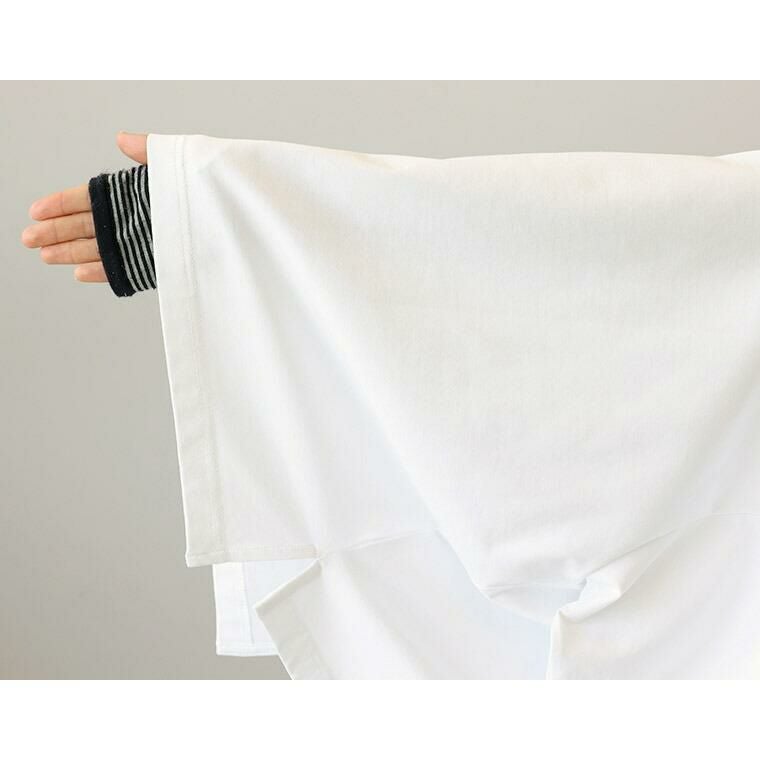 着丈はヒップの上くらい。袖丈は肘から1cm下。ベーシックなデザインでボトムを選ばず◎。生地には伸縮性がありサイズ感もゆったりしているので窮屈感は全くありません。袖が長めで二の腕カバーしてくれます。