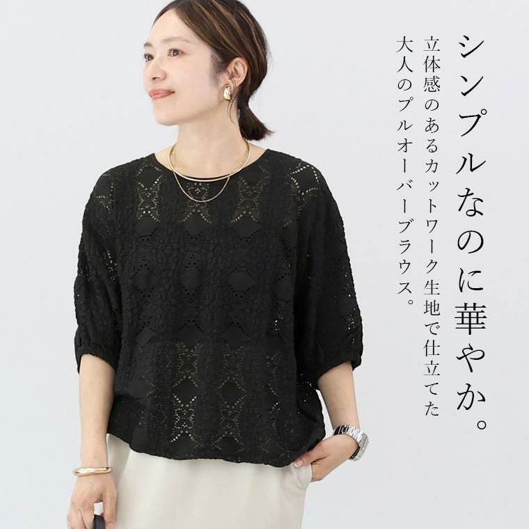 立体感のあるカットワークレースが涼やかに映える、大人のプルオーバーブラウス。シワになりにくく、さらりとした着心地が魅力の快適素材です。後ろ襟の同色リボンがさりげなく女性らしさを添え、5分袖で気になる二の腕も自然にカバー。体型を拾わない身幅のゆったり設計で安心して着られ、白と黒のベーシックカラーはオンにもオフにも大活躍します。甘さを控えめにした上品なデザインで、大人の女性にちょうど良い可愛らしさを演出してくれる一枚です。