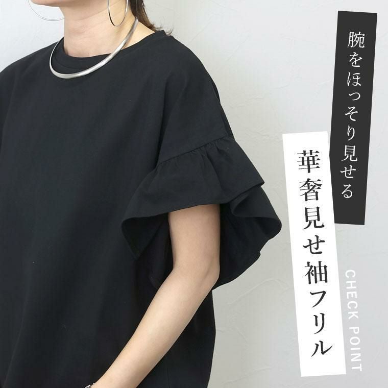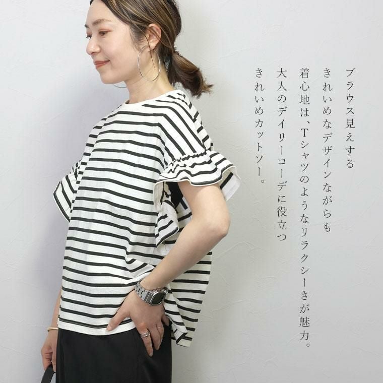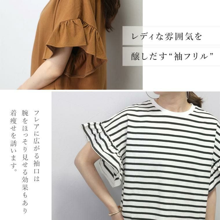 カットソー トップス ボーダー 無地 フレンチ袖 半袖 袖フリル 袖フレア ワイド ゆったり 脚長 スタイルアップ クルーネック 綿100 コットン ラフ イージーケア キレイ見え きれいめ キレイめ 綺麗め 上品 楽ちん ストレスフリー 体型カバー カジュアル ブラック 黒 くろ ライトブラウン ブラウン 茶 ちゃ ボーダー ぼーだー 黒白 ベーシック 人気 定番 カラバリ豊富 大きめ 大きい ワンマイルウエア ワンマイルウェア レディースファッション 無地 ラクチン らくちん 楽ちん 動きやすい プラスサイズ 着痩せ 華奢見え 脚長 脚長効果 ゆったりサイズ ゆる すっきり カバー 体型カバー きちんと シンプル カジュアル ナチュラル ベーシック オフィス オフィスカジュアル テレワーク 会議 食事会 ランチ 女友達 参観日 二次会 飲み会 上品 知的 女性らしい 女らしい 着映え オンライン飲み会 着回し 大人 大人カジュアル オトナ 女性 綺麗 きれい キレイ キレイめ 高見え 上質 大きいサイズ 細見え 女性服 アースカラー フリーサイズ 楽 ノンストレス 動きやすい ゆったり 高級感 母の日 プレゼント ギフト 贈り物 S M L LL 2L XL 20代 30代 40代 50代 おしゃれ パ―ト バイト 仕事 仕事用 ユニフォーム 春夏 春 夏 秋冬 秋 冬 お洒落 オシャレ かわいい 可愛い カワイイ かっこいい カッコいい FUNNY COMPANY ファニーカンパニー ふぁにーかんぱにー ファニカン