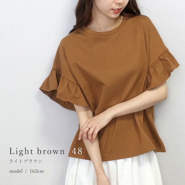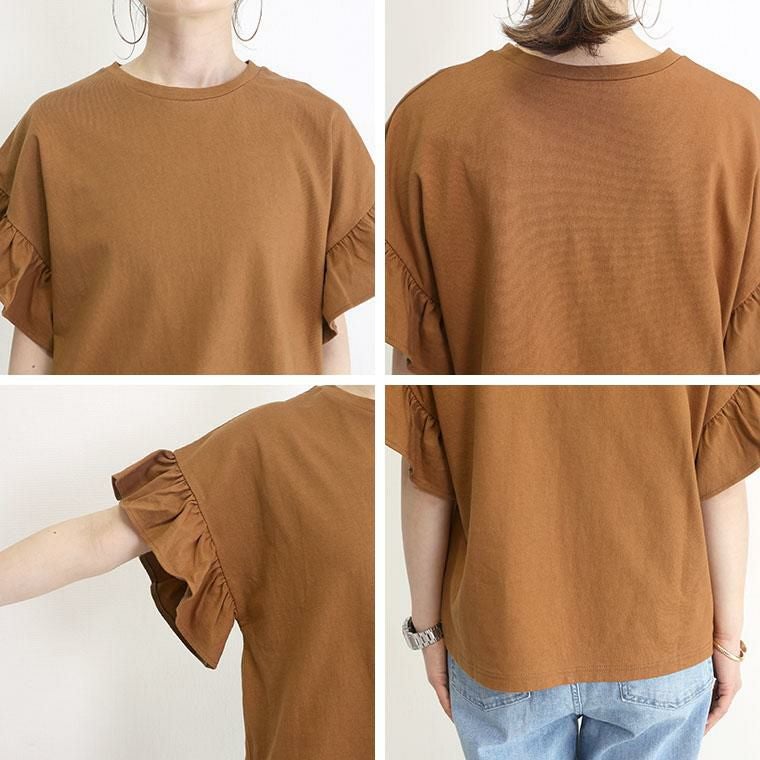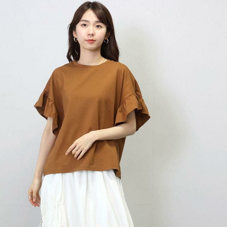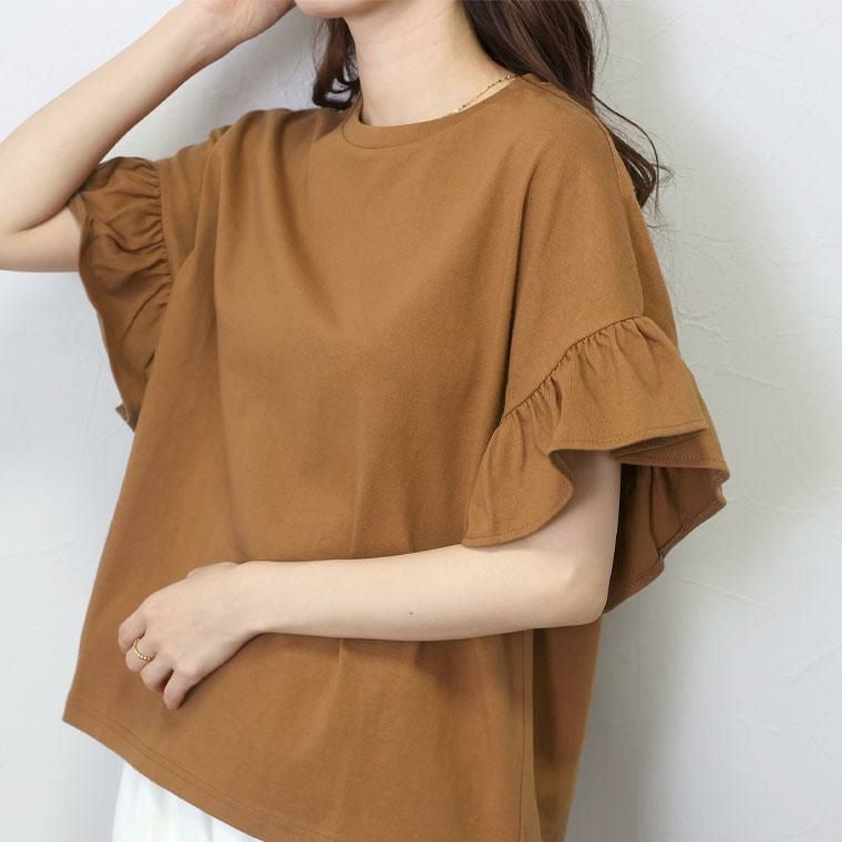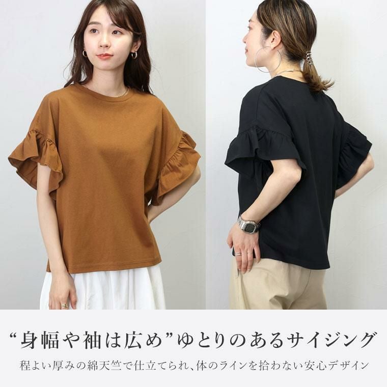 ほどよい薄さの綿天竺で仕立てたデザインカットソーです。通気性がよく吸湿性にも優れているから、汗ばむ季節でも快適な着心地。ゆとりのある身幅なので、体のラインを拾いにくく薄着の季節でも安心して着用いただけます。たっぷりの広がりが特徴の袖フリルが女性らしいアクセントに。着る人を選ばないベーシックなデザインは、大人のデイリーコーデに役立ちます。
