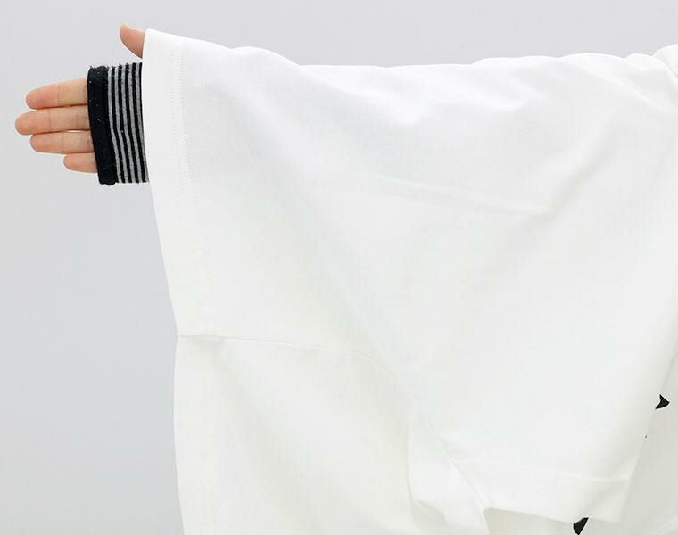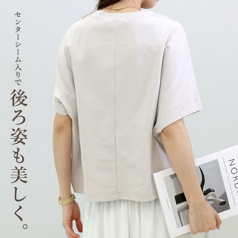 着丈はヒップが3分の1隠れるくらい。袖丈は肘から7cm上。ゆったりしたドルマンシルエットで二の腕やお腹まわりをカバーしてくれます。しっかりした生地ですが暑苦しさはなく夏に大活躍しそうです。