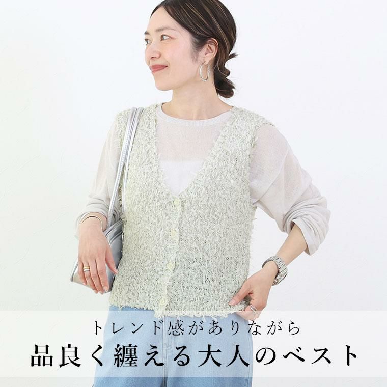 トレンド感がありながら、品よく纏える大人のベスト。麻タッチの風合いと、チュールテープヤーンの繊細なニュアンスが絶妙に調和。立体感のある編地が、さらりと着るだけでスタイリングを格上げします。程よくラフな編地が、大人のこなれ感を演出。ブラック×ネイビー、グレー×オフの上品な配色。単色では出せない奥行きのあるカラーが魅力です。深めのVネックが顔周りをすっきり見せ、女性らしさを引き立てます。ボタン付きで、着こなしにアクセントをプラス。長袖にもノースリーブにも重ねやすく、シーズンレスに活躍する一枚です。