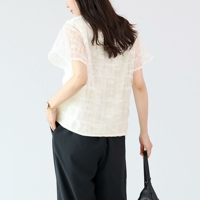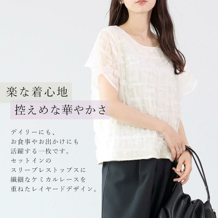 セットインのスリーブレストップスに、繊細なケミカルレースを重ねたレイヤードデザインです。Tシャツ感覚で気軽に着られつつ、レースの華やかさでぐっと女性らしい印象に。内側は柔らかな肌あたりのストレッチ素材で、見た目以上に着心地が良いです。レースとインナーは襟ぐり・袖・裾で縫い合わされており、着ている間にずれにくく安心。ボートネックが首元をすっきりと見せ、上品な抜け感を演出。タックイン不要の着丈。二の腕まわりはレースでやわらかくカバーされ、通気性もあり涼やかです。カジュアルなパンツにも、きれいめなスカートにも相性が良く、着回し力も抜群です。デイリーにも、お食事やお出かけにも活躍する一枚です。