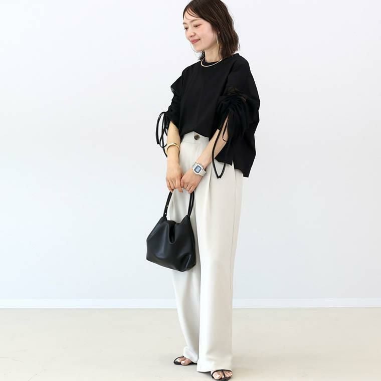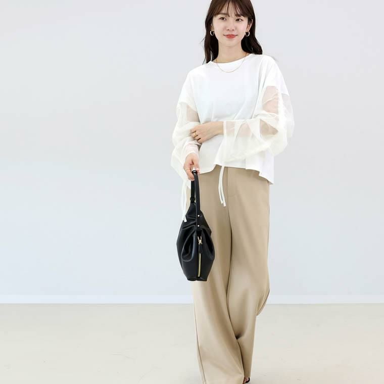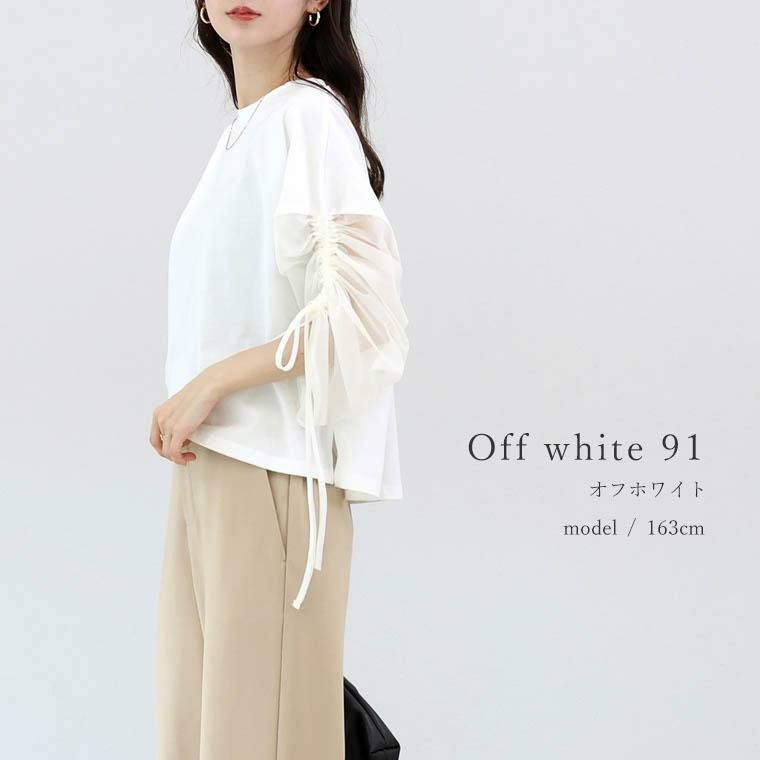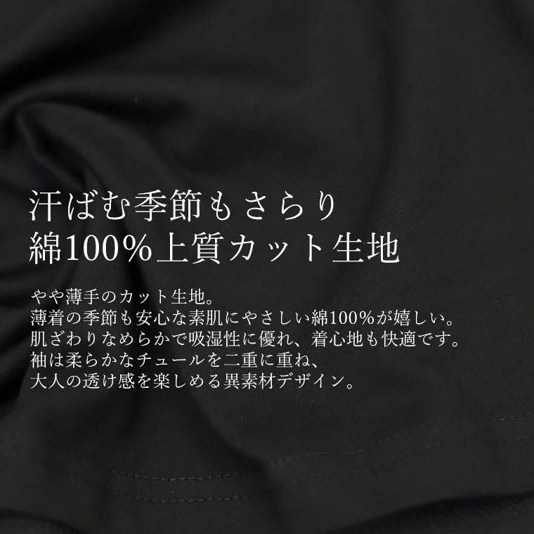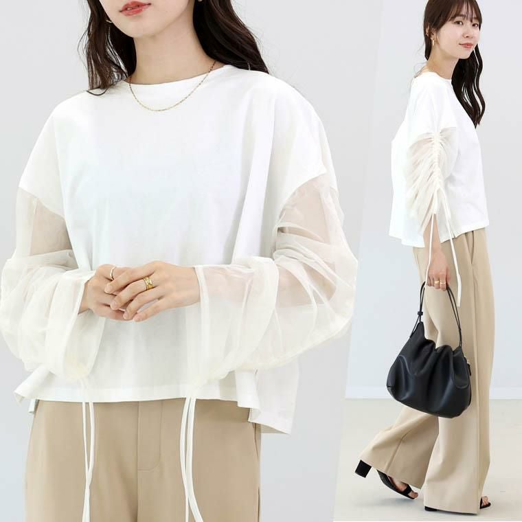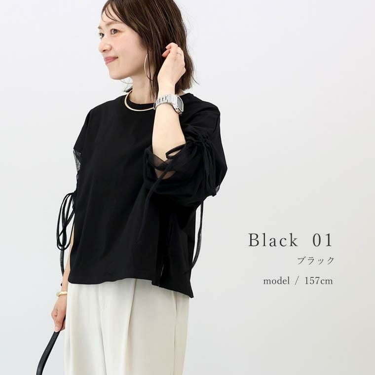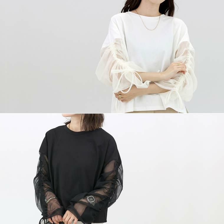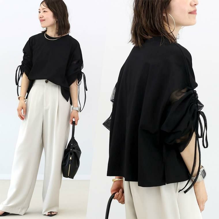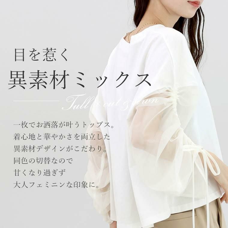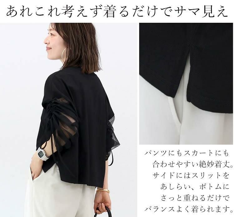 チュール×カットソーの異素材ミックスで、一枚で洒落見えするデザイントップス。身頃は綿100%の上質カット生地。肌ざわりなめらかで吸湿性に優れ、快適な着心地をお約束。袖は透け過ぎない2枚重ねのチュールで品よく、大人の肌見せをアピール。さらにドロストでシルエット変幻自在。シアーな素材で通気性よく、蒸し暑い日もさらり涼しく過ごせます。体をふんわり包むワイドめな身幅で、ラインを拾わず体型カバー。パンツにもスカートにも合わせやすい着丈で着回し力抜群。袖デザインのトップスは、サロペットやベストなどとのレイヤード使いにもおすすめです。涼しさと華やかさを両立した、夏のワードローブにぴったりの一枚。