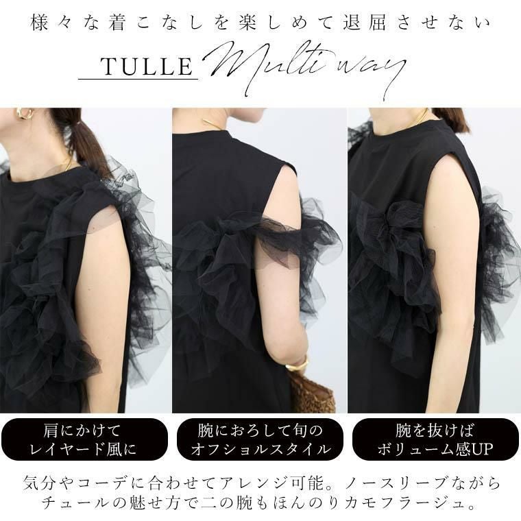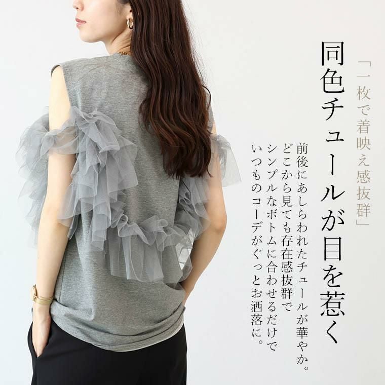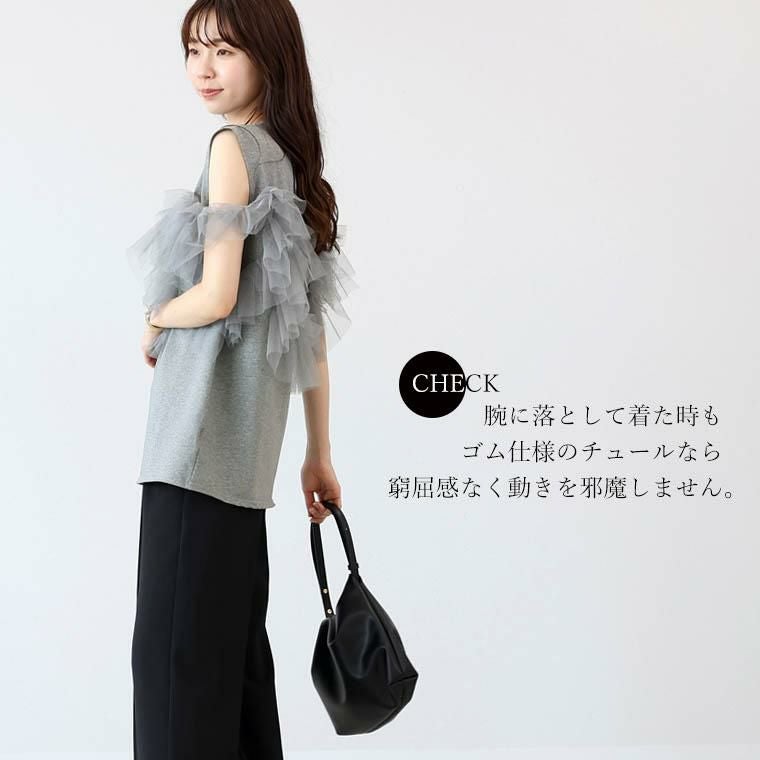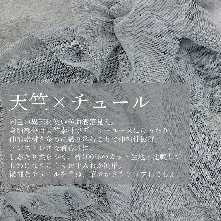天竺素材のカットソーにチュールをあしらったデザイントップス。伸縮素材を多めに織り込むことで肌あたりやわらかく、リラクシングな着心地に。綿100%のカット生地と比べてシワにもなりにくくお手入れも簡単です。前後に大胆に施されたチュールが華やか。フェミニンな印象のチュールデザインも、身生地と同色のチュールなら甘くなり過ぎず大人も取り入れやすいよう計算されています。チュールは肩にかけたり、腕に落としてオフショルダーとしても着られるマルチwayデザイン。お好みで様々な着こなしを楽しめます。着映え感と女性らしさを誘う主役トップスです。