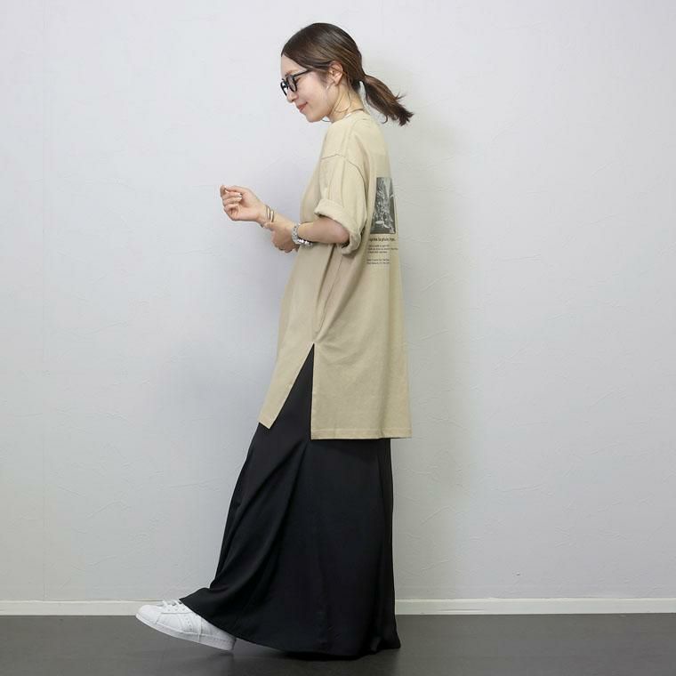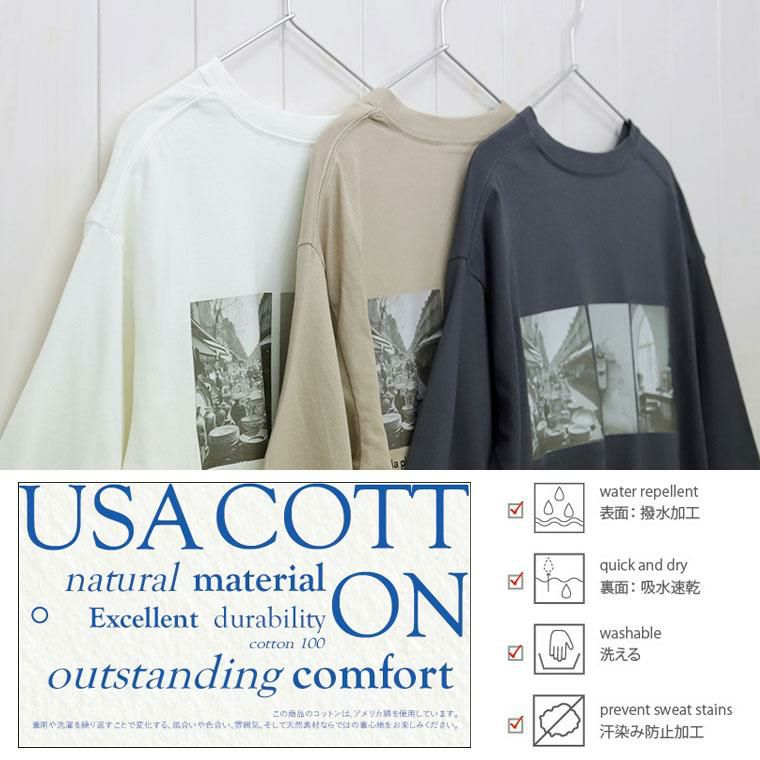フランスのヴィンテージをイメージしたモノクロームなプリントがお洒落なカットソー。フォトの上下にあるロゴもポイントです。生地は汗ばむ季節もストレスなく着られる機能素材を採用。着こむほどに風合いが増していくUSAコットンに、表側は撥水加工、裏側は吸水速乾加工を施し、汗をかいた時も表ににじみにくく快適な着心地に。表側は汚れも付きにくくなっています。肘まで隠れる袖丈と、身体を包み込むオーバーサイズが華奢見えさせてくれます。大人のカジュアルスタイルにフィットするアイテムです。