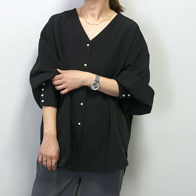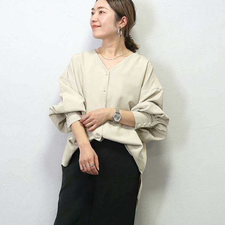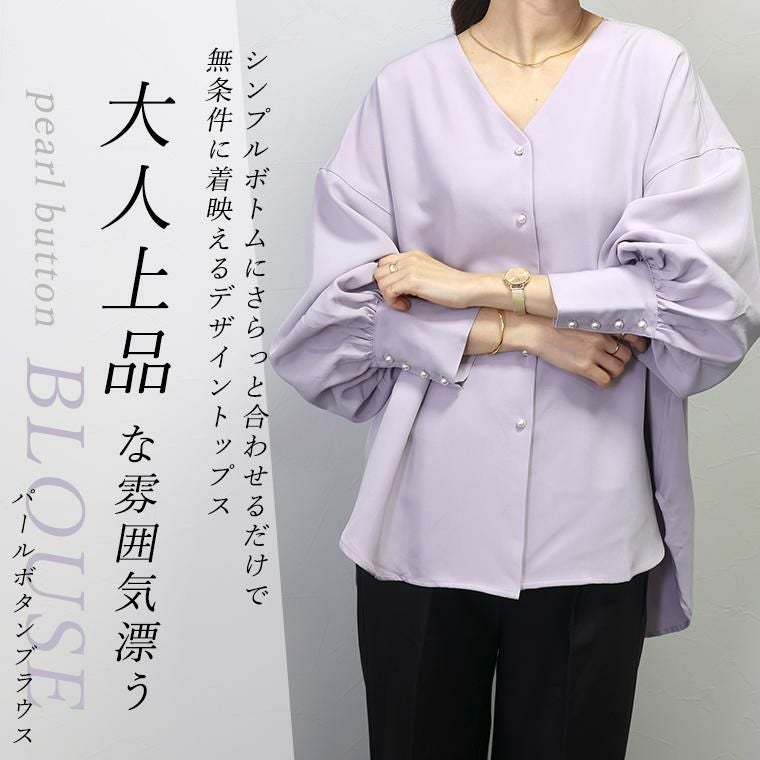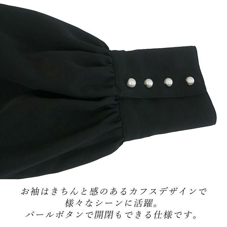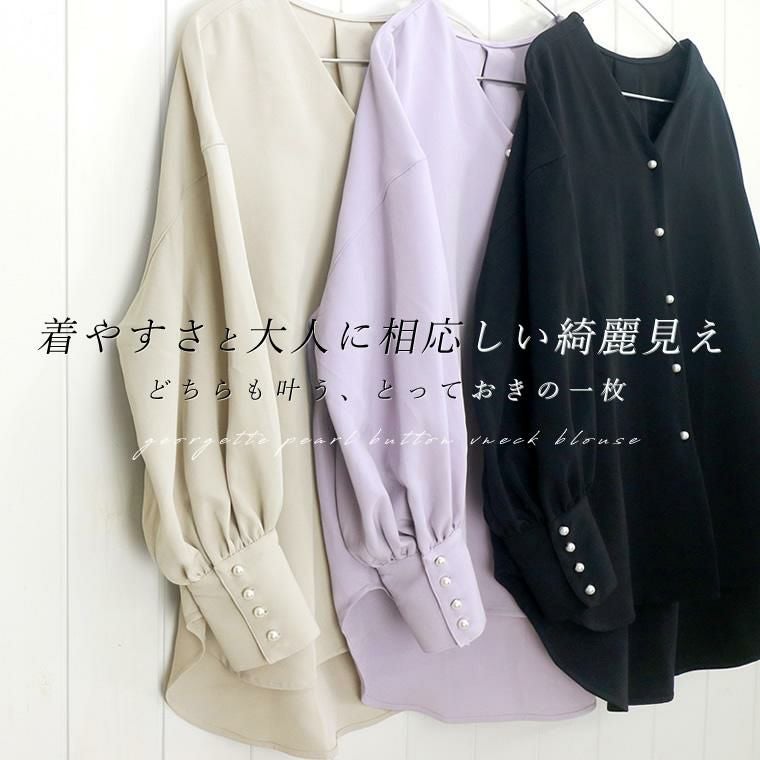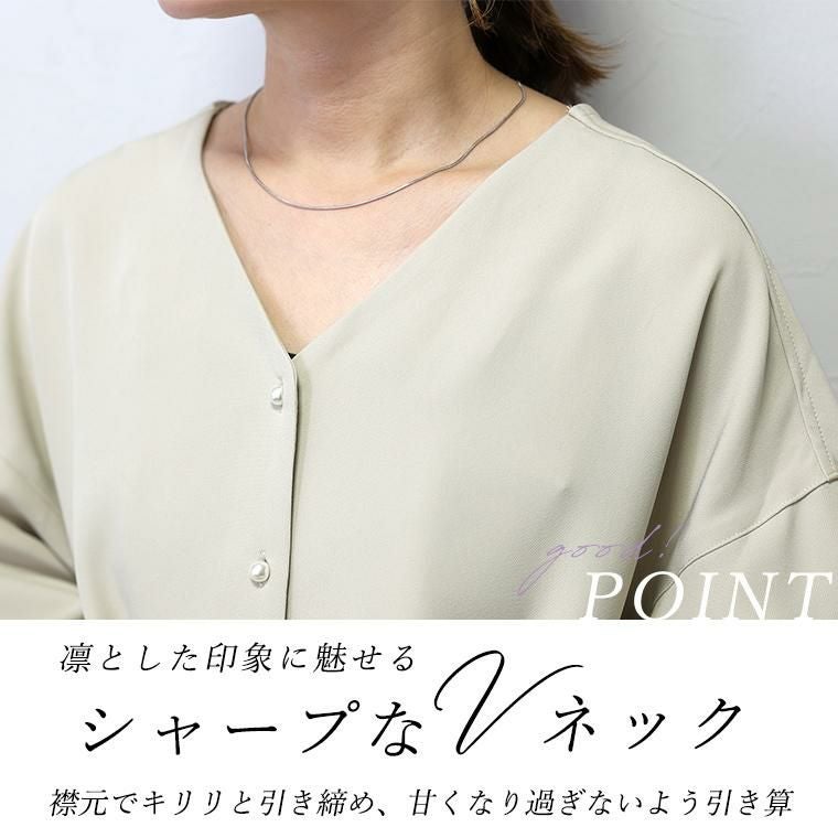 ジョーゼットパールボタンVネックブラウス フロントと袖口のパールボタンが上品な雰囲気を醸し出し さっと着るだけで女性らしい着こなしが完成する、Vネックブラウス。 カジュアルにもきれいめにも対応する、艶感のあるエステルスパン生地を採用。 伸縮素材ポリウレタンを織り込み、着心地の楽さにもこだわりました。 襟元は顔周りをすっきりと見せてくれる、ノーカラーのVネック。 この襟元のおかげで女性らしいデザインブラウスも甘くなりすぎず、 シャープな印象に仕上げてくれます。たっぷりとギャザーを寄せた ふんわりとしたお袖はパールと相まって手元をぐっと華やかに。 きちんと着映え、オンオフ様々なシーンで活躍してくれる一枚です。 【 シルエット違いのアイテムもチェック!! 】