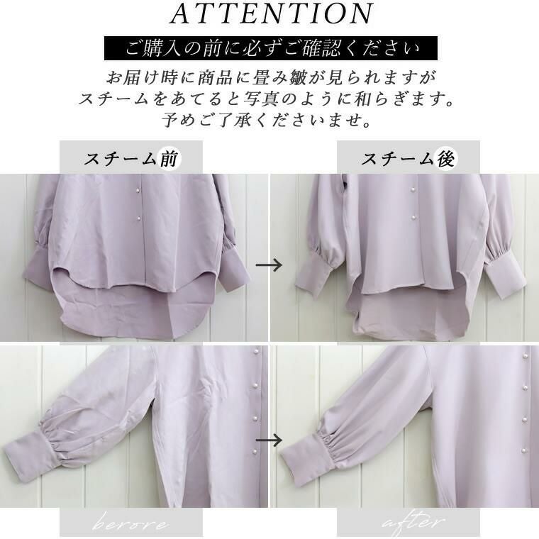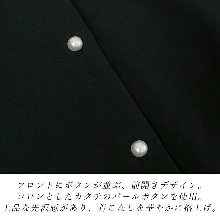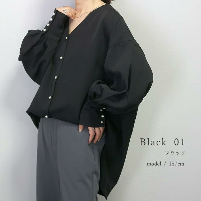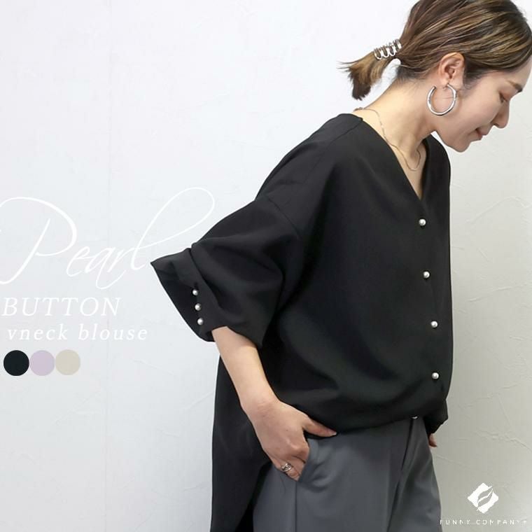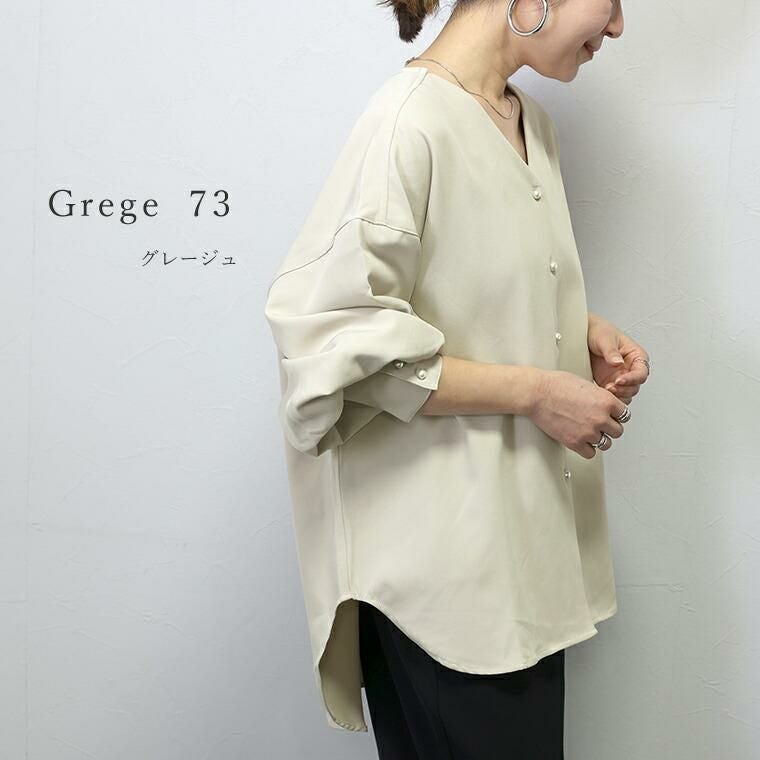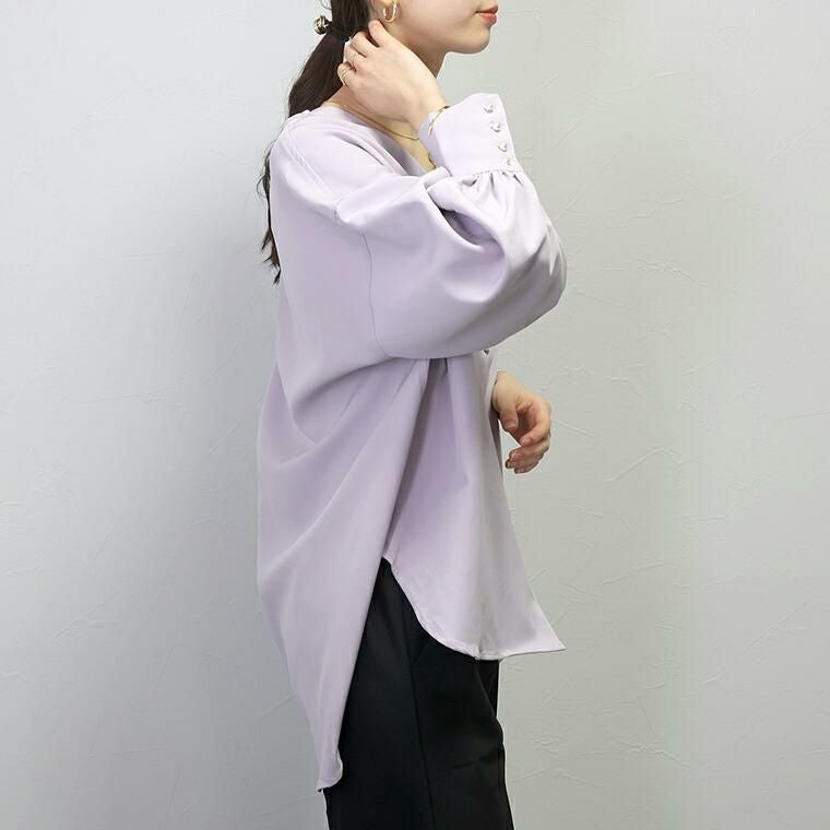 ジョーゼットパールボタンVネックブラウス フロントと袖口のパールボタンが上品な雰囲気を醸し出し さっと着るだけで女性らしい着こなしが完成する、Vネックブラウス。 カジュアルにもきれいめにも対応する、艶感のあるエステルスパン生地を採用。 伸縮素材ポリウレタンを織り込み、着心地の楽さにもこだわりました。 襟元は顔周りをすっきりと見せてくれる、ノーカラーのVネック。 この襟元のおかげで女性らしいデザインブラウスも甘くなりすぎず、 シャープな印象に仕上げてくれます。たっぷりとギャザーを寄せた ふんわりとしたお袖はパールと相まって手元をぐっと華やかに。 きちんと着映え、オンオフ様々なシーンで活躍してくれる一枚です。 【 シルエット違いのアイテムもチェック!! 】