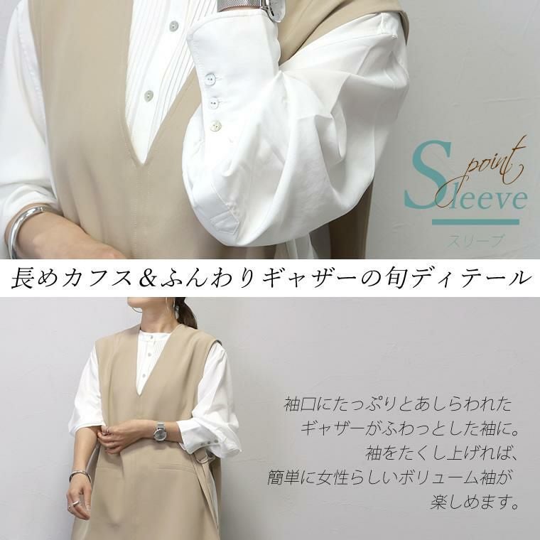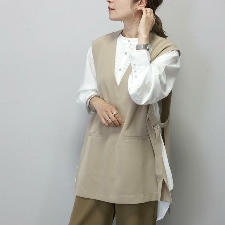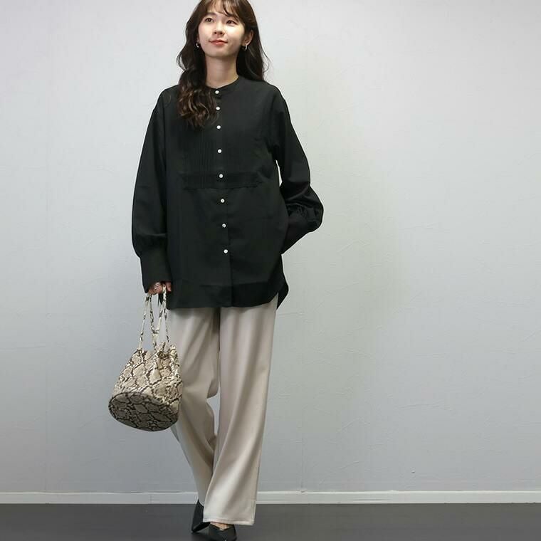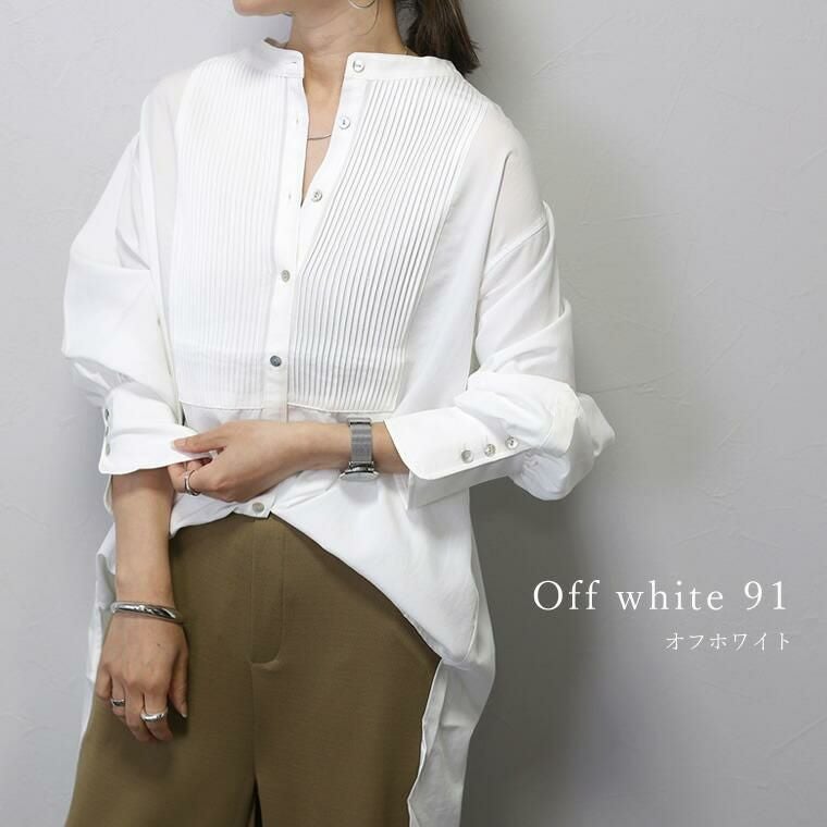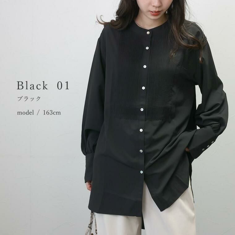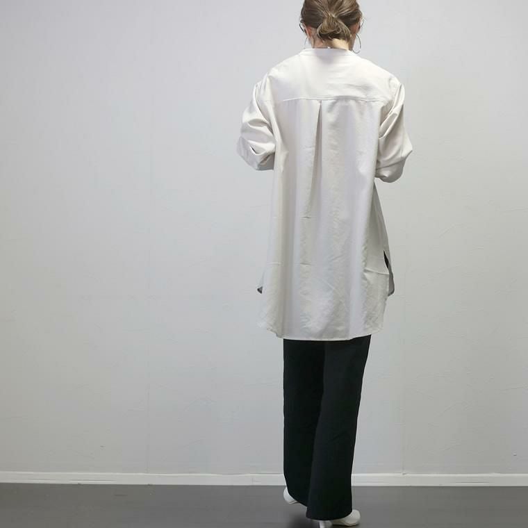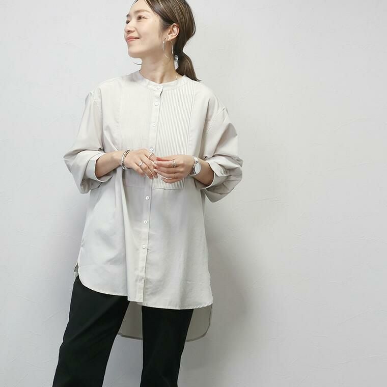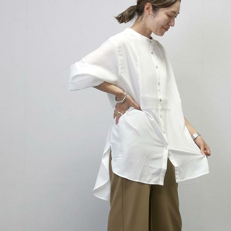 エステルローンピンタックシャツチュニック 一枚で存在感ある上品な装いに仕上がるピンタックデザインシャツ。 丁寧にたたまれたフロントのピンタック使いがきちんと感ある 表情をみせ、クラシカルな雰囲気に。さらに、首元をすっきりみせる バンドカラーで大人度もぐんとアップします。生地は、さらさらとした柔らかな 肌触りのローン生地を採用。マットな光沢があり、無地ながらもどこか華やかかつ 上品な着こなしに。比較的しわにもなりづらくお手入れが簡単なのも嬉しい ポイントです。ヒップをすっぽり隠す長めの着丈で、安心してお洒落を楽しめる一着。