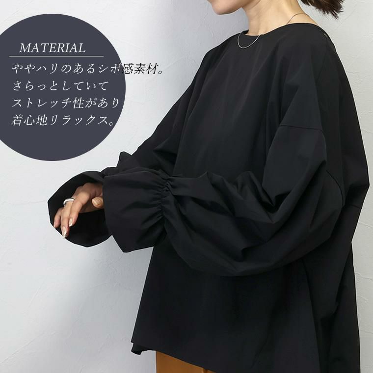キャンディースリーブ後ろギャザーブラウス 1枚で華やいだ雰囲気をまとえるキャンディースリーブブラウス。 ボリューム感のある袖にキャンディーのように絞ったカタチが大人 フェミニンで、手首を細くみせてくれる効果も。袖口のゴムが優しくとまるので 腕まくりも楽々です。生地はややハリのあるシボ感素材。さらりとした 軽い生地でストレッチ性もあり、リラクシーな着心地です。シルエットは やや裾に向かって広がるAライン。加えて背中のバックギャザーがふんわり、 気になるボディーラインをカモフラージュしてくれます。ベストや サロペットとのレイヤードも楽しめ、スタイリングの幅が広がります。