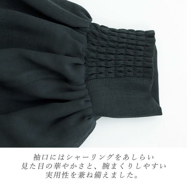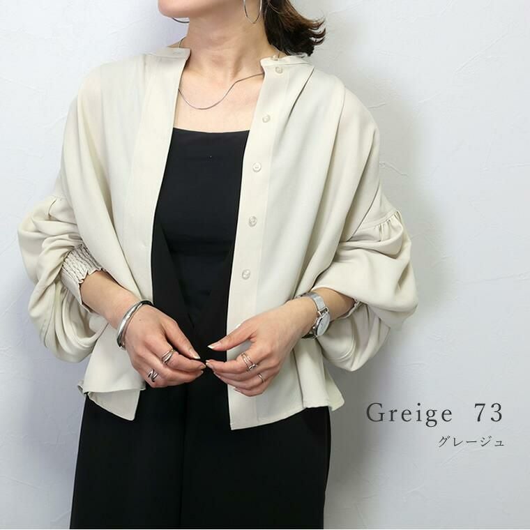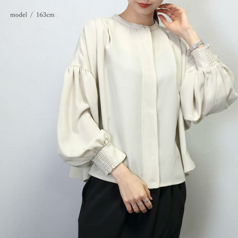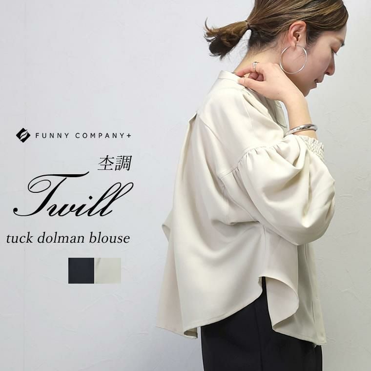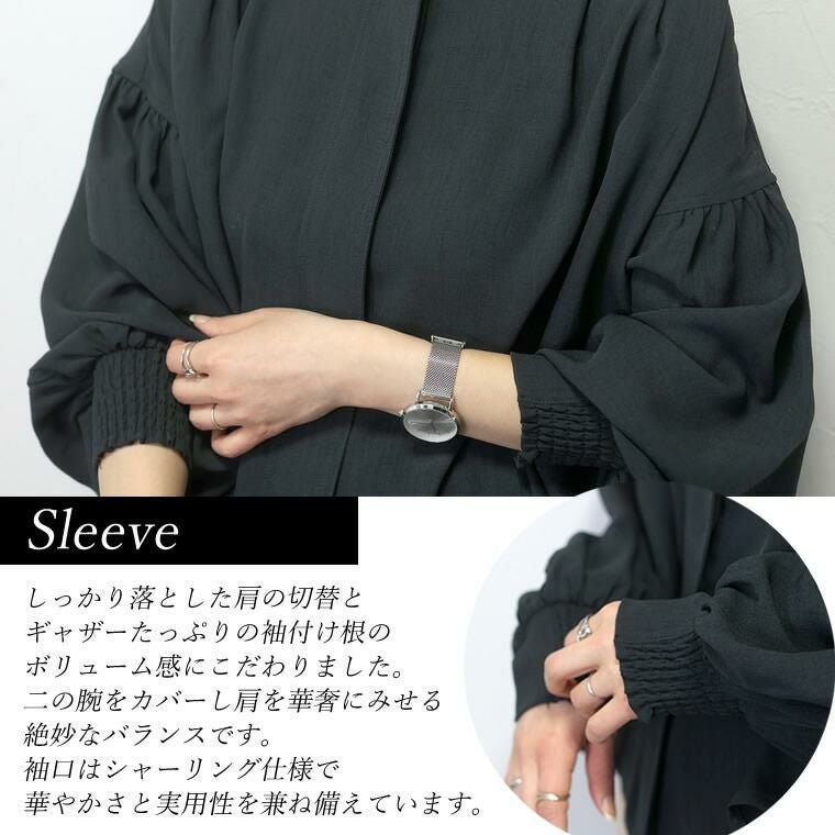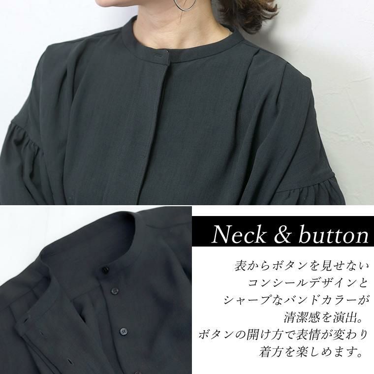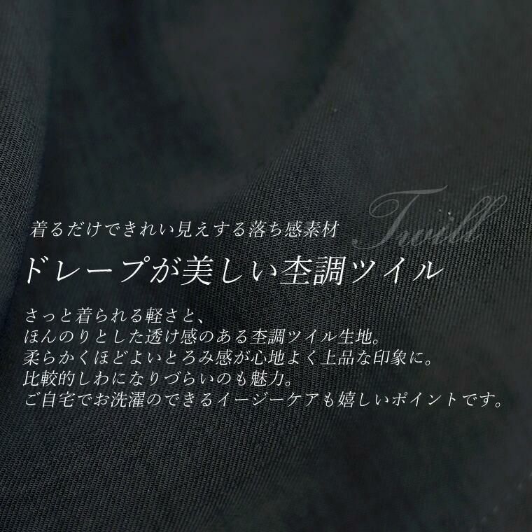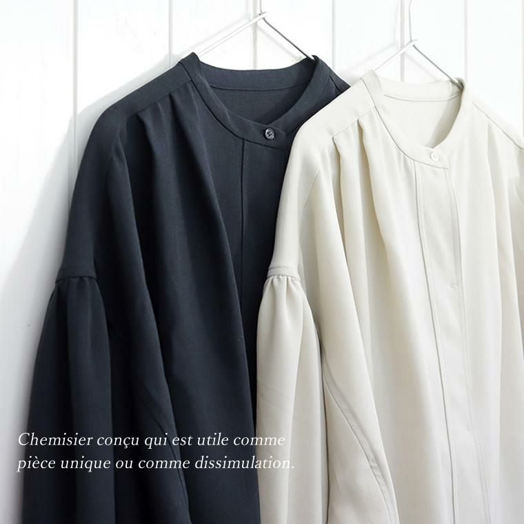 杢調ツイルタック使いドルマンブラウス シンプルなボトムに合わせるだけできちんと感ある スタイルが完成する大人ブラウスの登場。バックヨークやショルダーに タックやギャザーをふんだんに施したデザイン性の高い一着です。 さらっとした肌触りながらなめらかな落ち感のある杢調ツイル生地で タックから落ちるドレープが上品な印象を与えます。シャープな バンドカラーはボタンの隠れる比翼仕立てになっており、よりきれいめな 表情に。またボタンを開けて羽織りとしても活躍します。しっかり落とした 肩の切替とたっぷりギャザーのボリュームバランスにもこだわりました。 デイリーに、オフィスシーンに重宝するとろみシャツブラウスです。 【 同素材のジャケットはこちら 】