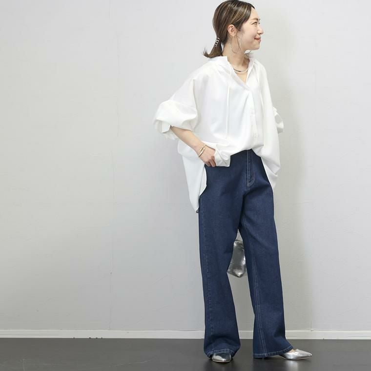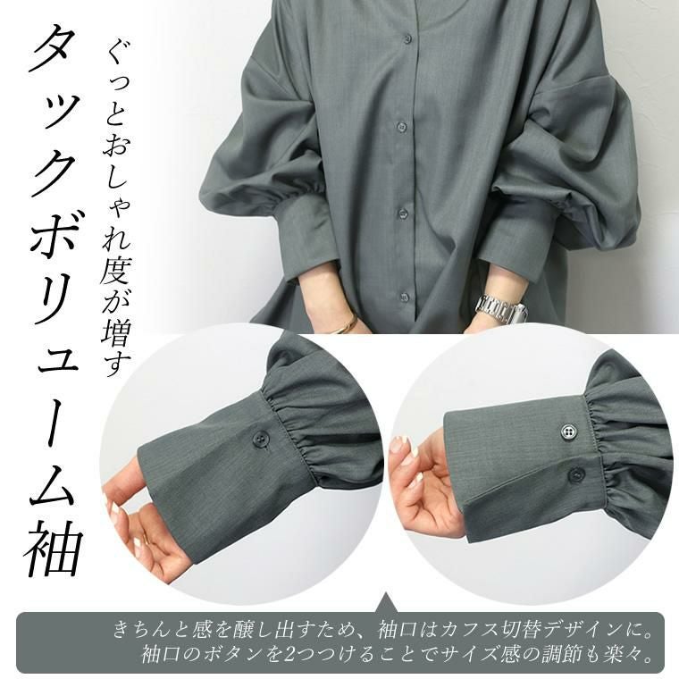ほんのりハリのある杢調ツイルで仕立てたシャツブラウス。襟元、袖、バックヨーク、リンキングに細かなギャザーや丁寧なタックをたっぷりとあしらい、ドレーピーなシルエットを演出。ドレープが生む立体感が体のラインをカバーしながらこなれた雰囲気に。さり気ない艶感も上品見えする魅力です。襟元はスキッパーネックで抜け感を誘う。お好みでリボンの有無を選べるのも嬉しい。しっかり肩を落としたドロップショルダーは上半身を華奢に見せます。贅沢にギャザーを寄せた袖口は、きちんと感を醸し出すためにカフス切替デザインに。ボタンを2つつけることでサイズの調節ができ、スリットのように見えるのも特徴です。ヒップがしっかり隠れる着丈で安心。羽織としても着られ、季節の変わり目にもおすすめです。