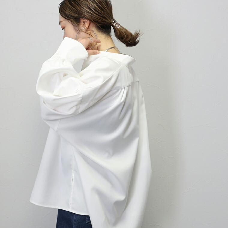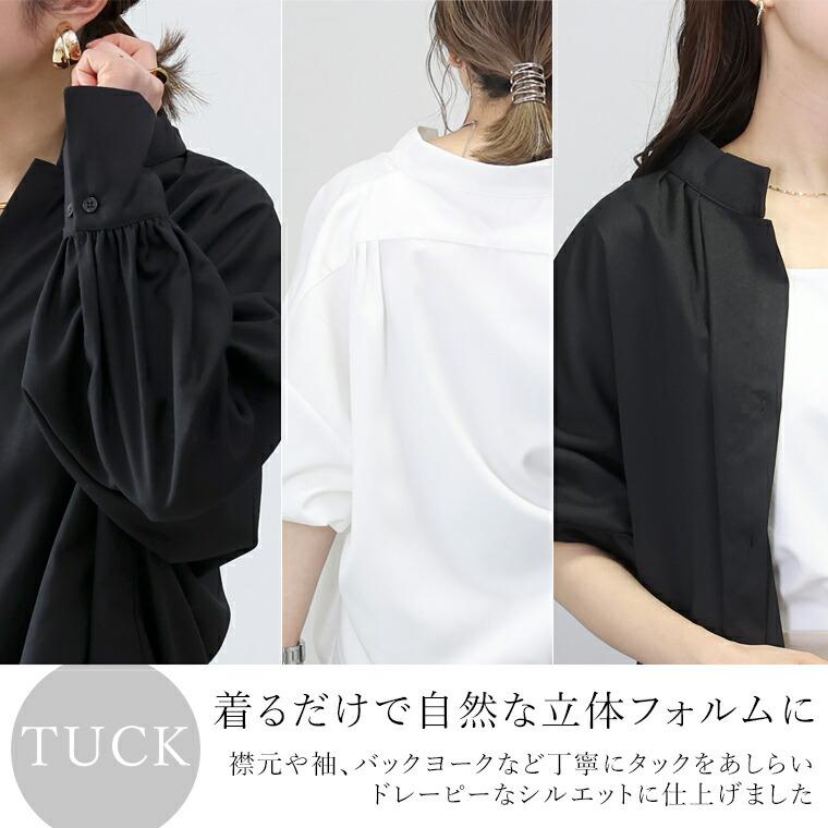 ほんのりハリのある杢調ツイルで仕立てたシャツブラウス。襟元、袖、バックヨーク、リンキングに細かなギャザーや丁寧なタックをたっぷりとあしらい、ドレーピーなシルエットを演出。ドレープが生む立体感が体のラインをカバーしながらこなれた雰囲気に。さり気ない艶感も上品見えする魅力です。襟元はスキッパーネックで抜け感を誘う。しっかり肩を落としたドロップショルダーは上半身を華奢に見せます。贅沢にギャザーを寄せた袖口は、きちんと感を醸し出すためにカフス切替デザインに。ボタンを2つつけることでサイズの調節ができ、スリットのように見えるのも特徴です。ヒップがしっかり隠れる着丈で安心。羽織としても着られ、季節の変わり目にもおすすめです。