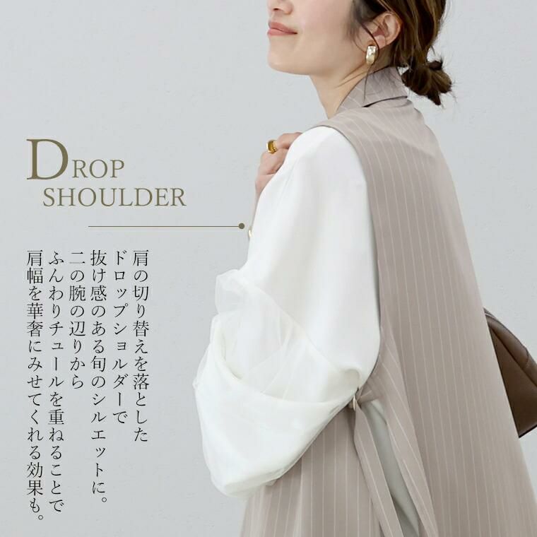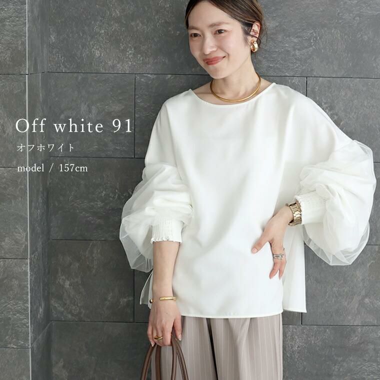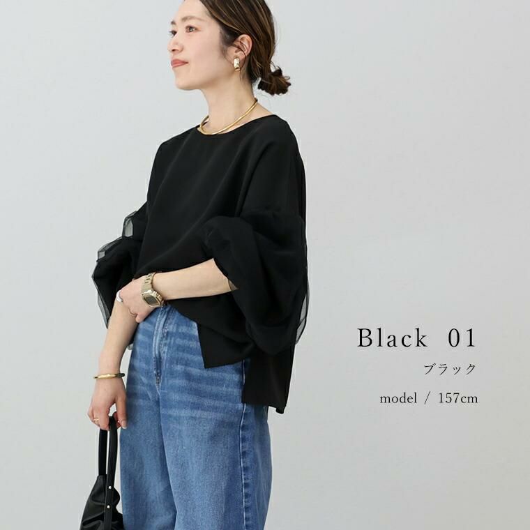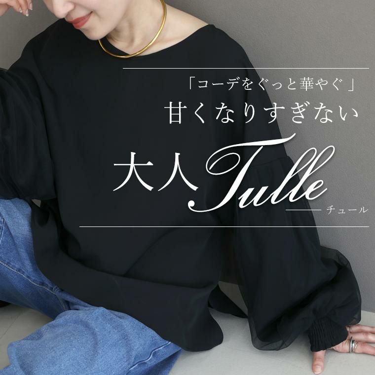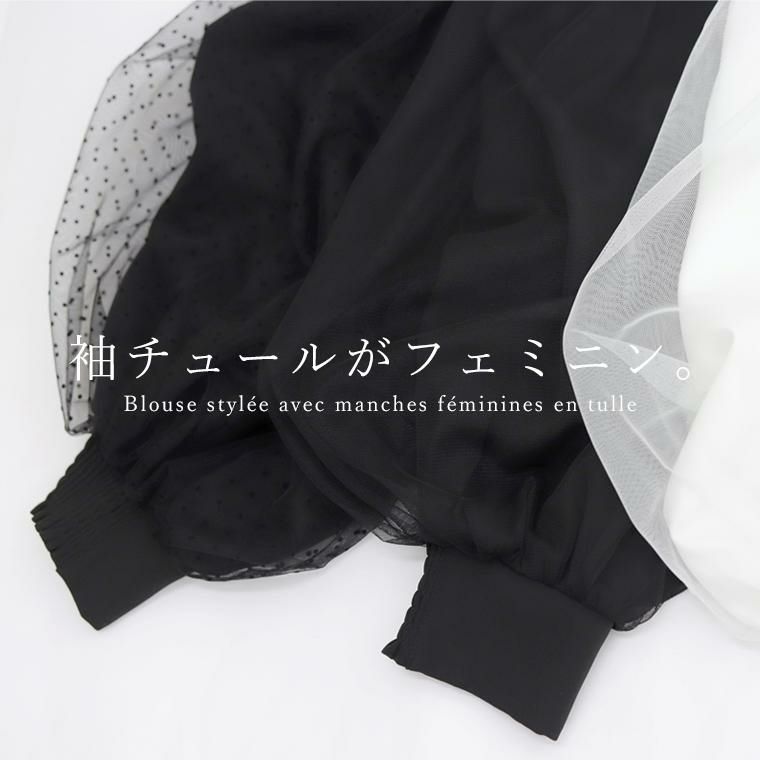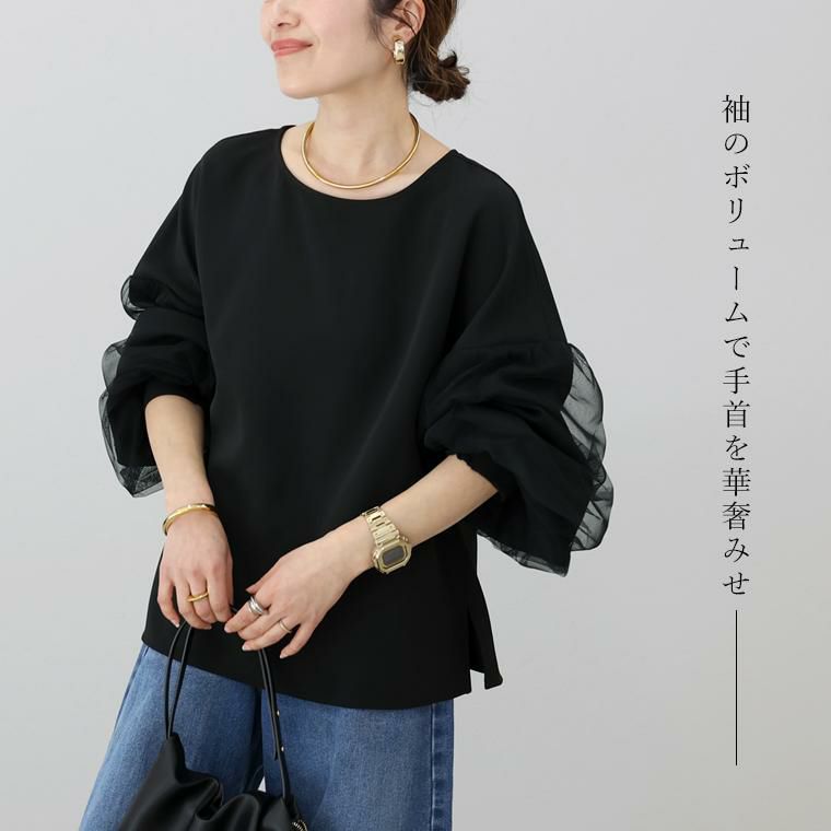 袖にチュールを重ねたデザインがフェミニンなブラウス。甘くなりがちなチュールも部分使いや位置にこだわり、大人も取り入れやすいデザインに昇華。ぽわんとしたシルエットが今年らしいボリューム袖で、袖口はシャーリングになっているのでお好みのバランスに調節が可能。腕まくりもしやすく、日常動作にストレスを与えません。ブラウス生地にはほんのりと艶感のあるジョーゼット素材を採用。伸縮素材を織り込むことでしわになりづらくお手入れがしやすいのも魅力。上品な印象を与え、きれいめなスタイルにおすすめです。チュールは無地とフロッキードットの2種類からお選びいただけます。一枚ではもちろんサロペットやベストのインとも相性抜群。コーデをぐっと華やぐデザインブラウスです。