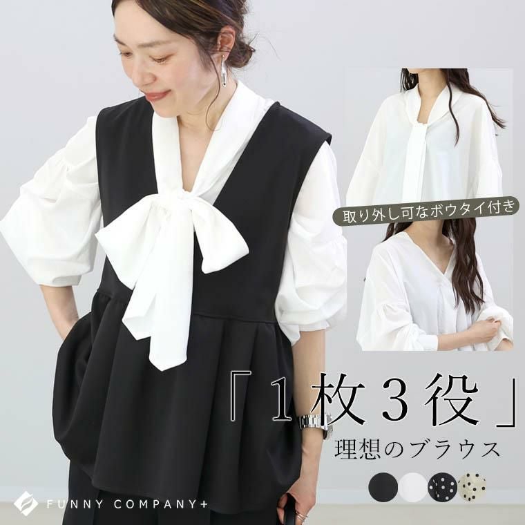 シャツ ブラウス シャツブラウス とろみ エアリー イージーケア スキッパー 襟 ノーカラー ボウタイ タイ リボン 3WAY 後ろボタン バックボタン 袖ボリューム ボリューム袖 ボリュームスリーブ ギャザー 袖ゴム シャーリング キレイ見え きれいめ キレイめ 綺麗め 上品 クラシカル 楽ちん イージー イージー素材 ルーズ ゆるめ 抜け感 ストレスフリー ヒップが隠れる ラインカバー 体型カバー 無地 ドット 水玉 オケージョン 謝恩会 入園 入学 卒園 卒業 パーティー エステルローン 黒 ブラック 白 ホワイト オフ オフホワイト どっとブラック ドットオフベージュ ベーシック 人気 定番 カラバリ豊富 大きめ 大きい ワンマイルウエア ワンマイルウェア レディースファッション 無地 ラクチン らくちん 楽ちん 動きやすい プラスサイズ 着痩せ 華奢見え ゆったりサイズ ゆる すっきり カバー 体型カバー きちんと シンプル カジュアル ナチュラル ベーシック オフィス オフィスカジュアル テレワーク リモートワーク リモート 会議 食事会 ランチ 女友達 参観日 二次会 飲み会 上品 知的 女性らしい 女らしい 着映え オンライン飲み会 着回し 大人 大人カジュアル オトナ 女性 綺麗 きれい キレイ キレイめ 高見え 上質 上品 大きめ 大きい 大きいサイズ 体型カバー 華奢見え 着痩せ 細見え 着回し 大人 大人カジュアル オトナ 女性 綺麗 女性 女性服 アースカラー フリーサイズ レディースファッション ラクチン 楽 らくちん 楽ちん ノンストレス 動きやすい プラスサイズ 着回し プラスサイズ ゆったり ゆったりサイズ ゆる すっきり シンプル 無地 きれい キレイ きれいめ キレイめ 高見え 上質 高級感 母の日 プレゼント ギフト 贈り物 S M L LL 2L XL 20代 30代 40代 50代 おしゃれ パ―ト バイト 仕事 仕事用 ユニフォーム 春夏 春 夏 秋冬 秋 冬 お洒落 オシャレ かわいい 可愛い カワイイ かっこいい カッコいい FUNNY COMPANY ファニーカンパニー ふぁにーかんぱにー ファニカン
