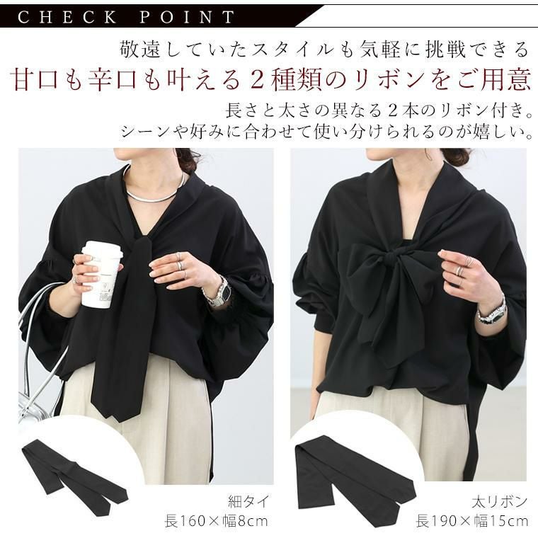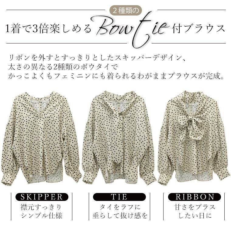 「デイリーシーンにもオケージョンにも着られて、さらにリボンの結び方も好みで選びたい。」そんな欲張りなリクエストに1着で応えられるようなブラウスを企画しました。ボウタイを外すと襟元すっきりのスキッパーブラウス。胸元のVラインが抜け感を誘い、顔周りをシャープにみせて小顔効果も。当店で定評のあるデザインです。オケージョンやビジネスシーンなどにも役立つ取り外し可能なボウタイ付き。さらに当店では「タイトでかっこいい」と「女性らしく華やか」を好みで選べるよう2種類のリボンをご用意しました。それぞれ納得のバランスになるよう何度も施策を重ね、理想の長さ&太さにこだわりました。カラーは無地とドットの選べる4色展開。あらゆるシーンで着まわしていただきたい、自慢のおすすめブラウスです。