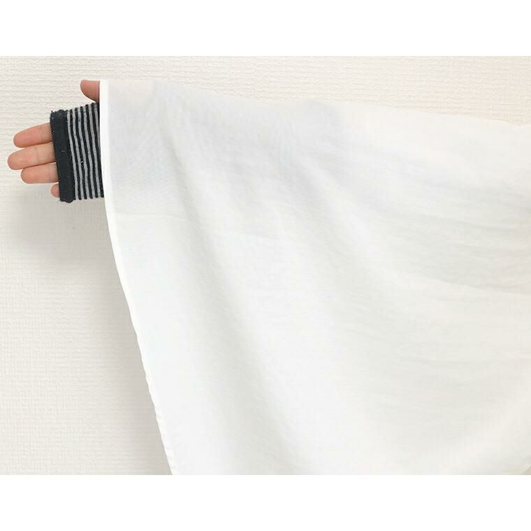 着丈はヒップが3分の2隠れるくらい。袖丈は手首から10cm下。伸縮性はありませんが身幅はゆったりしていてインナーを着ても◎。とても薄手なので春先にも使えるアイテムだと思います。首元のVが深めで顔まわりスッキリです。