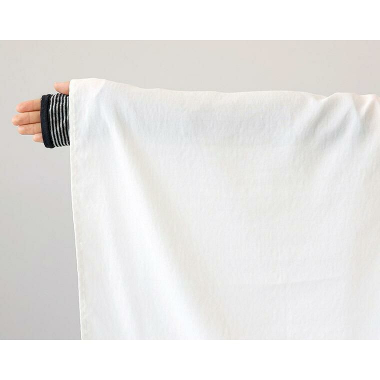 着丈はヒップが少し出るくらい。袖丈は肘から8cm上。伸縮性はありませんが身幅が広く楽に着れます。袖口も広めで風通しが良さそうです。襟は横に広めに開いていますがインナー見えは心配なさそうです。
