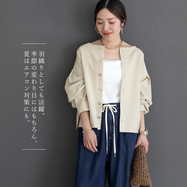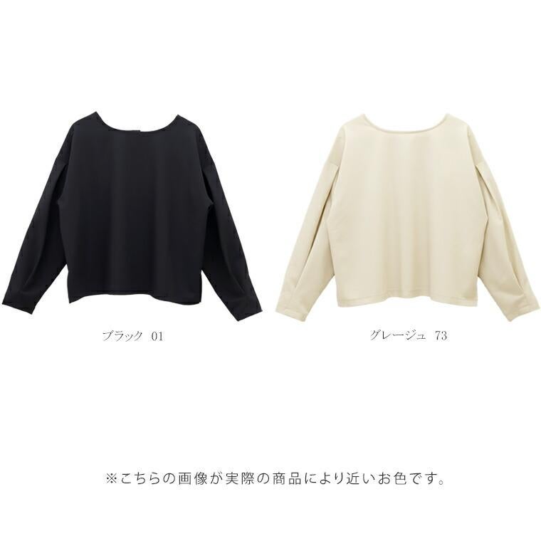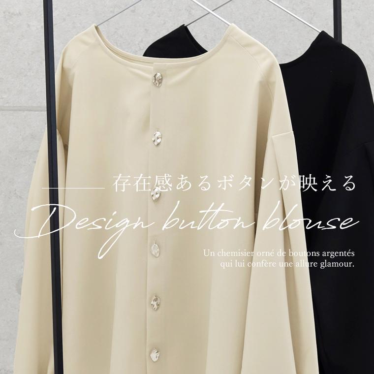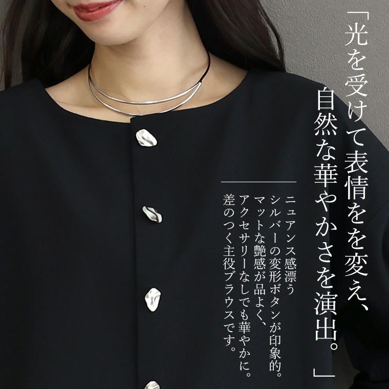 ニュアンス感漂うシルバーの立体ボタンが主役の華やぎブラウス。やや大きめのデザインボタンが動くたびに陰影と艶を生み、表情豊かに。ノーアクセサリーでもしっかりお洒落なスタイリングが完成します。前後で着用できる2way仕様で旬の後ろボタンにも。もちろんボタン開閉も可能なので、季節の変わり目には羽織りとしても重宝します。ドロップショルダー×ワイドな身幅のゆったり抜け感を誘うシルエット。着るとサイドが落ちる設計になっており、身体を大きく見せません。袖付け根と袖口にはタックを入れ、女性らしい立体スリーブに。生地は当店人気の後ろボタンブラウスと同じ生地を採用。やや厚みのあるしっかりした生地感でしわになりにくくお手入れも楽々。ほどよいハリで体のラインや中に重ねたインナーにも響きづらく、着心地快適です。一枚でも羽織りでもきちんと華やぐ万能ブラウスです。