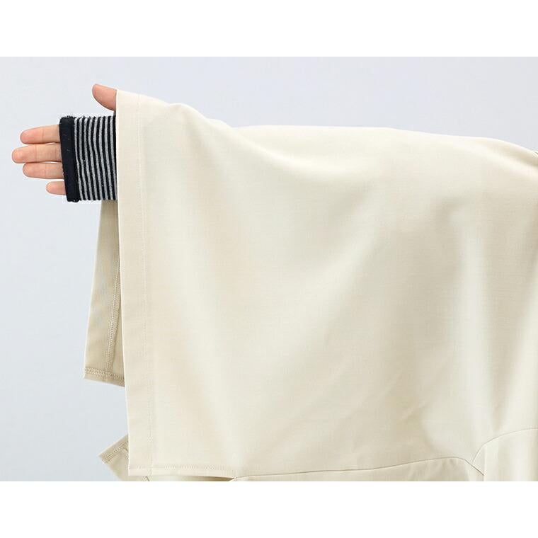着丈はヒップが3分の1隠れるくらい。袖丈は手首から10cm下。薄手の生地ですがややハリがあり体のラインを拾いません。襟は横に広く開いているのでインナー見えが気になりました。袖はタックになっていて腕まくりをしてもとまりません。
