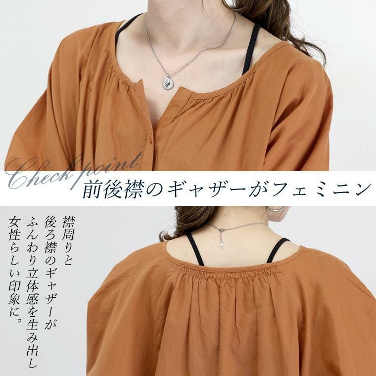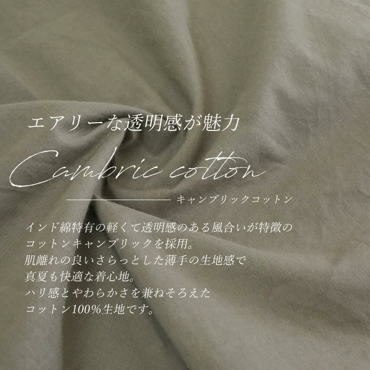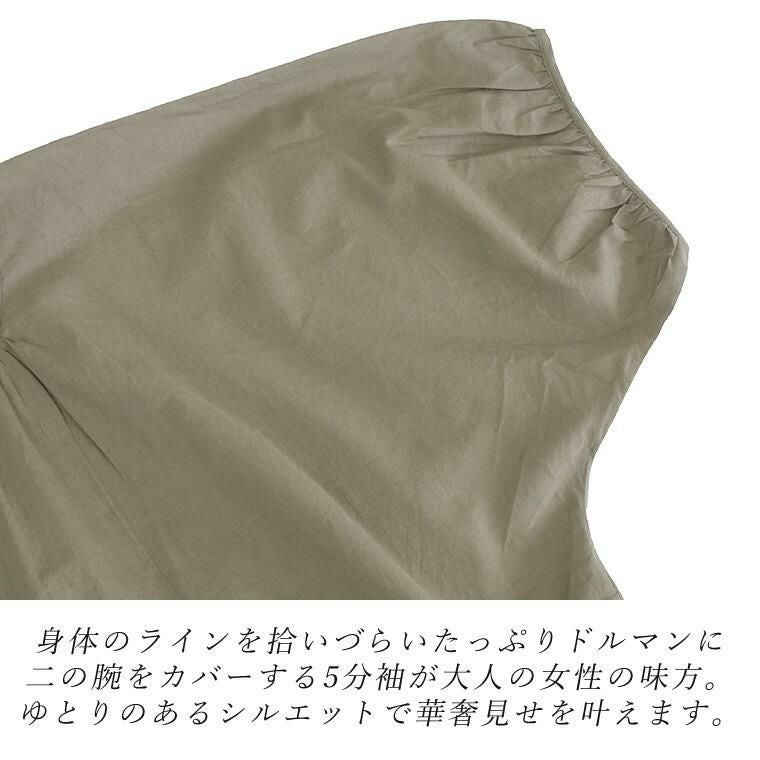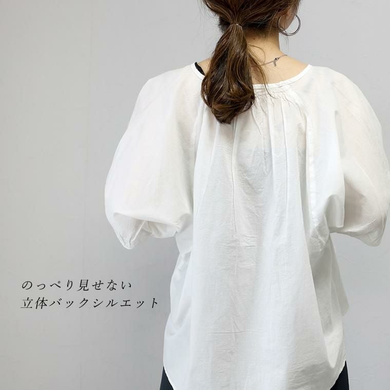 キャンブリックコットンドルマンブラウス インド綿特有の軽くて透明感のある風合いが特徴の コットンキャンブリック素材を使用したブラウスの登場です。 肌をやさしく透かせるシアーな生地感が女性らしさを引き立てると同時に、 トレンドスタイルを完成させます。肌離れの良いさらりとした綿100%で、 真夏も快適な着心地をお届け。身体のラインを拾わないドルマンシルエットも 大人の味方に。さらに、襟周りと後ろ襟にギャザーをあしらうことで 自然な立体感が生まれ、ふんわりやわらかなフォルムに仕上がります。 涼しい着心地とカバー力が同時に手に入る、夏におすすめの一着です。 ※この商品は、薄手の柔らかい生地を使用しています。 激しい運動や過度な力が加わりますと縫い目が破れたり、縫いしろが抜ける 場合があります。ご使用の際には十分ご注意ください。