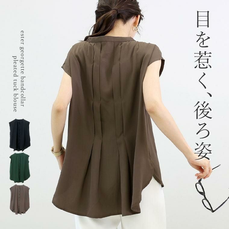 エステルジョーゼットプリーツタックバンドカラーブラウス