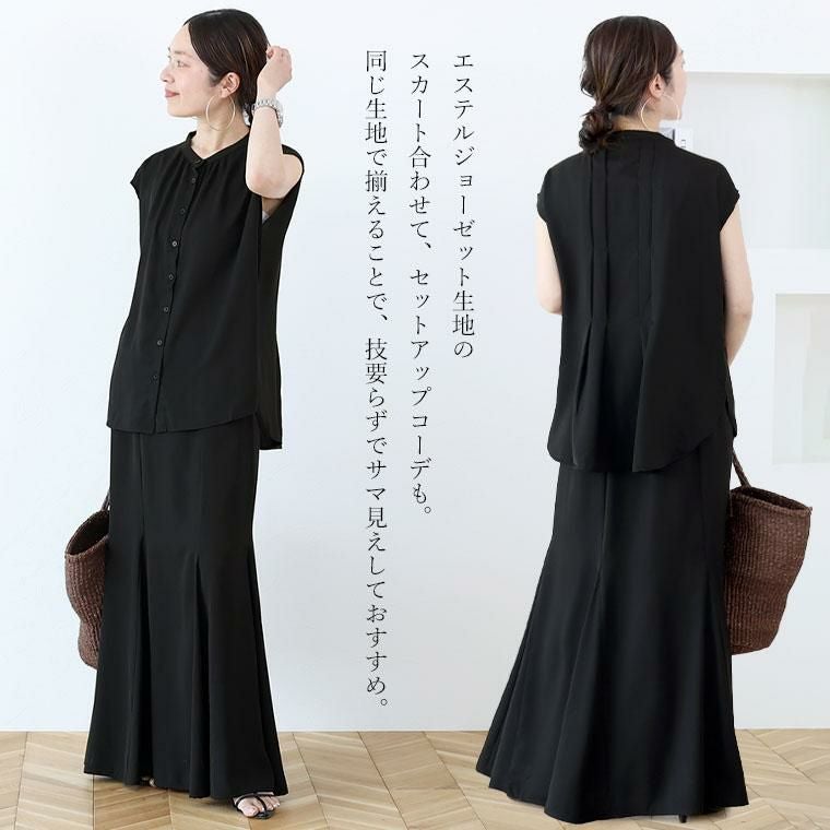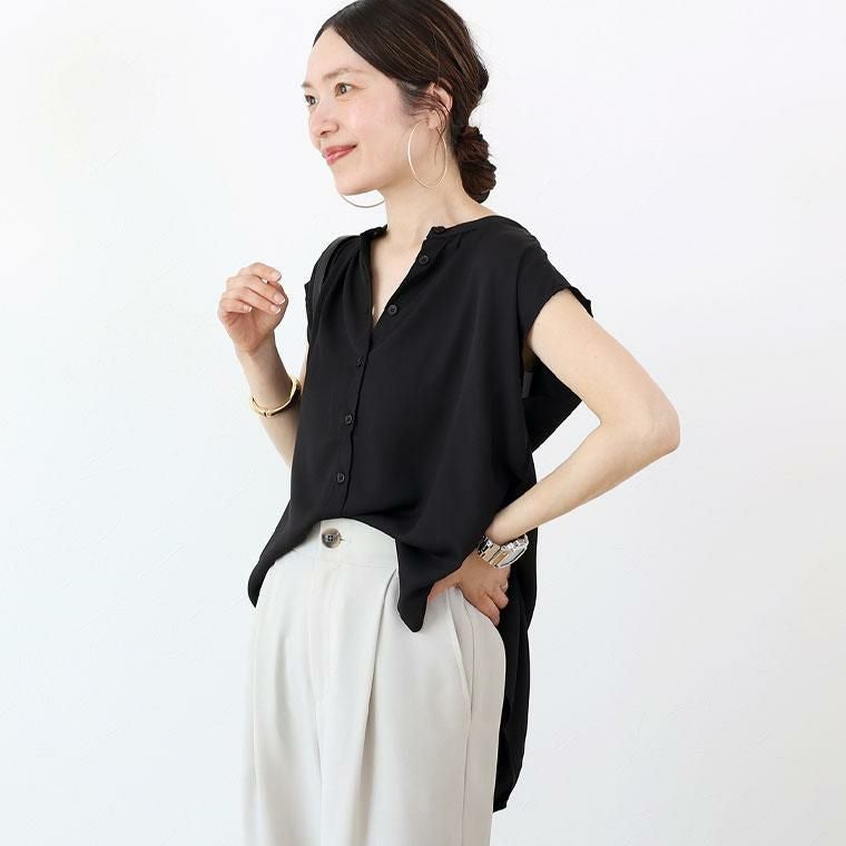 薄手のジョーゼット生地で仕立てた清涼感あるサマーブラウス。肌をほんのり透かせるシアーな生地感も、ダークトーンのクールな色展開で品よく、大人の色香を引き立てます。デザインはバンドカラー&フレンチスリーブを取り入れた人気シルエット。ボタンの開け方で表情が変わりコーディネートをたっぷり楽しめます。最大のポイントは後ろのタックプリーツ。丁寧にたたまれたプリーツがきちんと感を高め、さらに背中を小さく見せてくれる視覚効果も。トレンド不問で着られる大人に似合う夏ブラウスです。