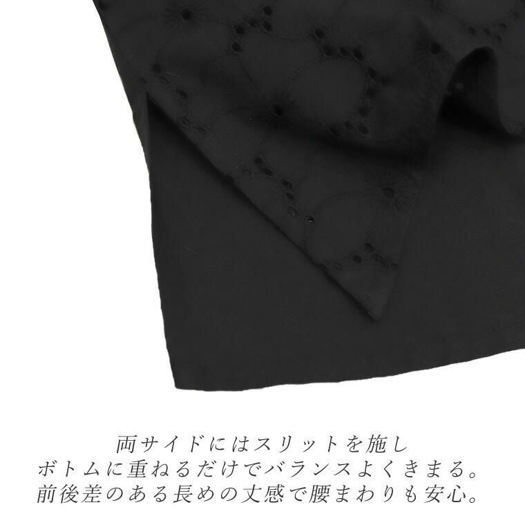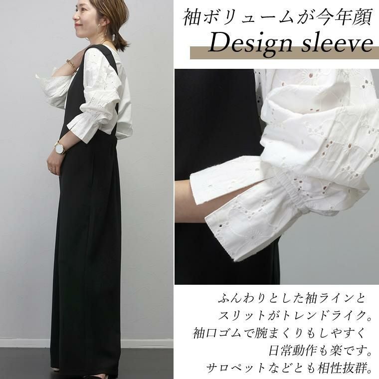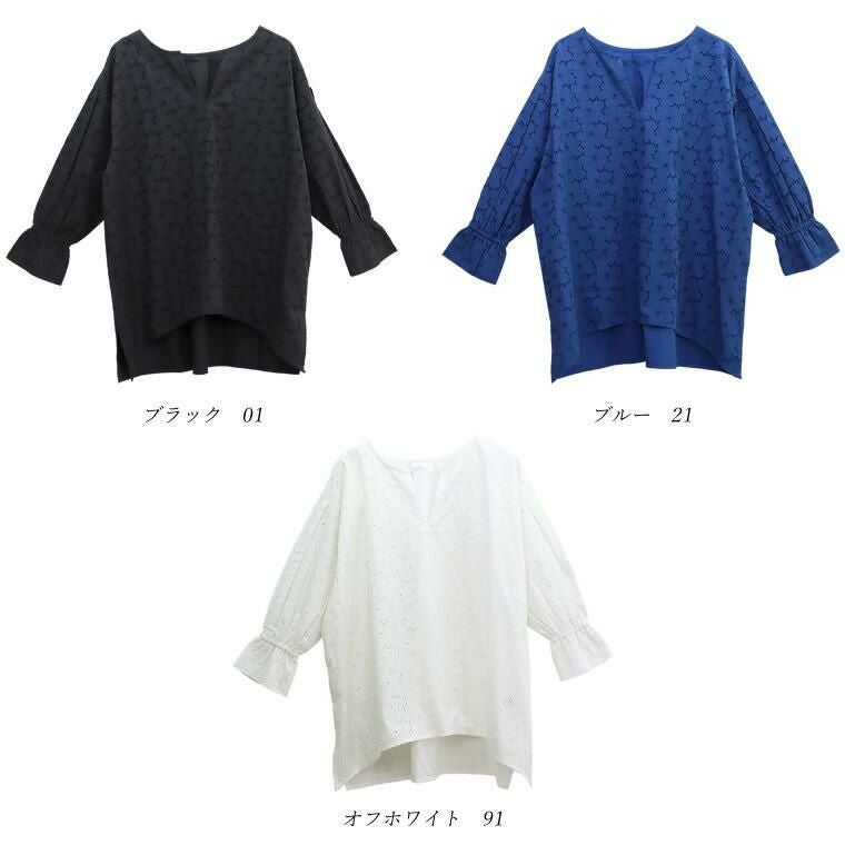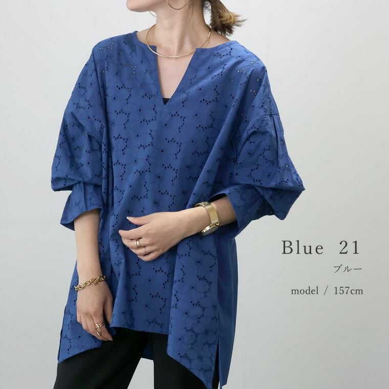 コットンポプリンカットワーク刺繍ブラウス 着映え感抜群、丁寧な刺繍生地が目を惹く主役ブラウス。 カットワーク刺繍が華やかで、大人が着やすいよう甘くなりすぎない レースに仕上げました。シルエットはボリュームが出過ぎないワイド。 ドロップショルダーでゆったりと着られます。長さがあり、気になる ヒップラインを隠してくれるのも嬉しいポイントです。 ぽわんとした立体袖もこだわり。袖口にはゴムが入っているので きゅっとたくし上げてお好みのシルエットに調節が可能。日常動作にも便利です。 360度どこから見てもサマ見え、レディーが加速する一着です。