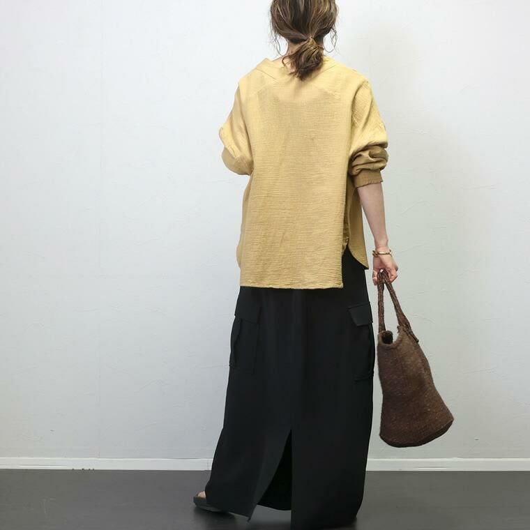 洗いにかけたようなふんわりやわらかなダブルガーゼで仕立てた両Vネックシャツ。インド綿ならではの通気性の良さと風合いが魅力です。シボ感があり肌に点で触れるため、汗ばむ季節も肌にべたつかず軽やかな着心地。やや深めに開いたVラインはデコルテを華奢見せ。後ろ襟もV開きで抜け感もアピールしています。袖口にはシャーリングをあしらい見た目を華やかに。腕まくりもしやすいので実用性にも優れています。緩やかに弧を描く裾のシルエットは後ろをやや長めに設定し後ろ姿も安心。ボタンを全開すれば羽織としても活躍、夏の装いを後押しする着心地も着映えも両方満足できる一着です。