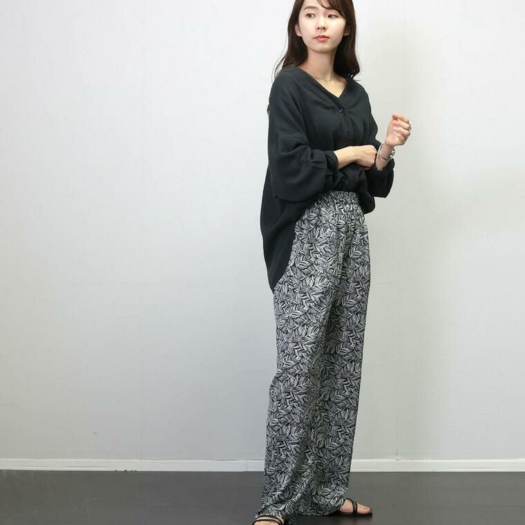 着丈はヒップが丁度隠れるくらい。袖丈は手首から7cm下。身幅にしっかり余裕があり体のラインを拾いません。襟が深く開いているのでインナー必須です。袖口にゴムが入っていてたくし上げると止ります。