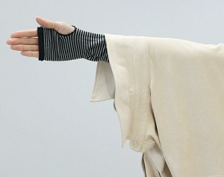 着丈は腰くらい。袖丈は手首から13cm下。ボタンを閉めても窮屈感はなく中に重ね着もできます。着丈は少し短めで袖丈は長めです。軽くて着心地が楽です。