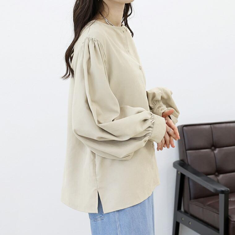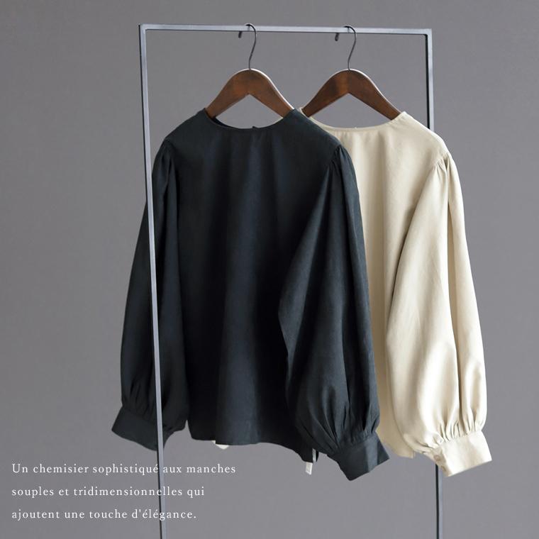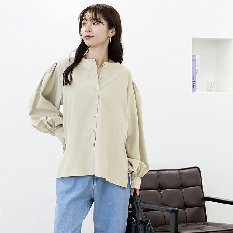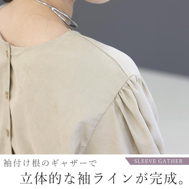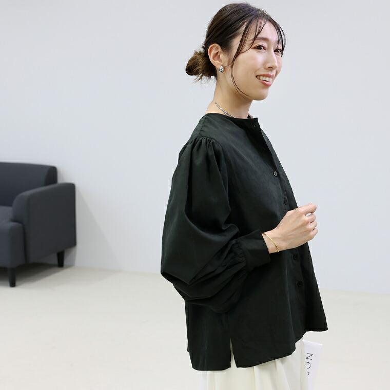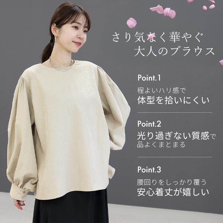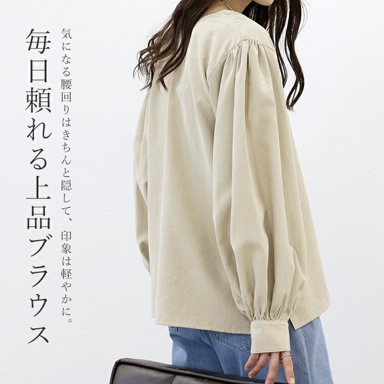 ふわっと立体感ある袖で、さりげなく華やぐ大人のブラウス。前後2WAYデザインできちんと感のある着こなしも抜け感のあるコーデもこれ一枚で。ボタンを後ろにして上品な印象に、ボタンを前にして開ければ抜け感のあるコーデに。袖付け根のギャザーと、袖口をやや外向きに設定、着るだけで立体的な袖ラインが完成し、二の腕をふんわりカバー。マットなピーチツイル素材で落ち着いた印象。微起毛のやわらかな風合いで肌あたりが優しい。体型を拾いにくい程よいハリ感も魅力です。光りすぎない質感で品よくまとまります。腰回りをしっかり覆う安心丈が嬉しい。両サイドスリットで動きやすく重く見えません。前だけインもしやすい設計です。パンツにもスカートにも合わせやすい。甘さときちんと感のバランスが絶妙。オフィスにも学校行事にも使える頼れる万能感。気になる腰回りはきちんと隠して、印象は軽やかに。毎日に頼れる上品ブラウスです。