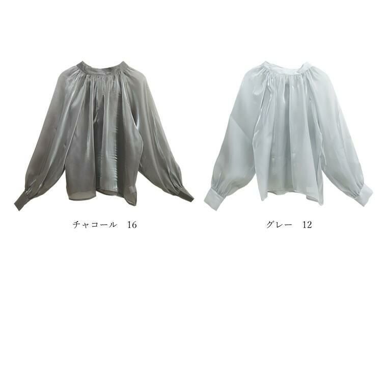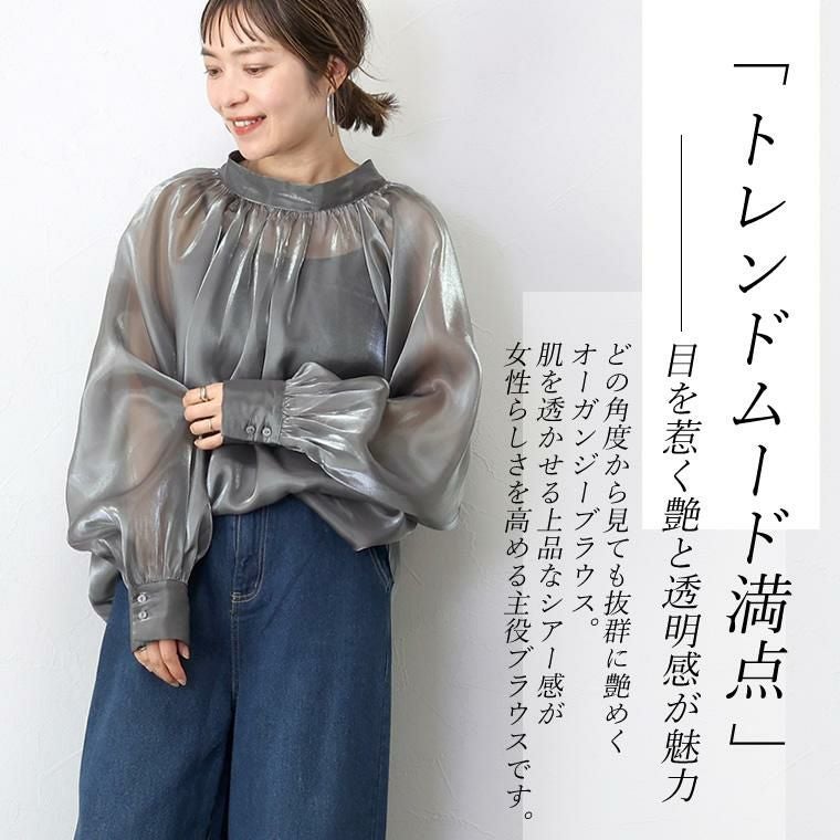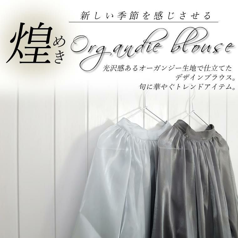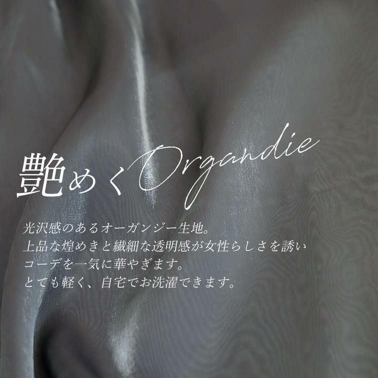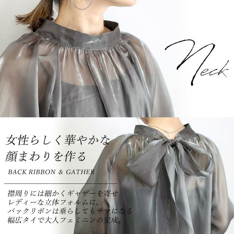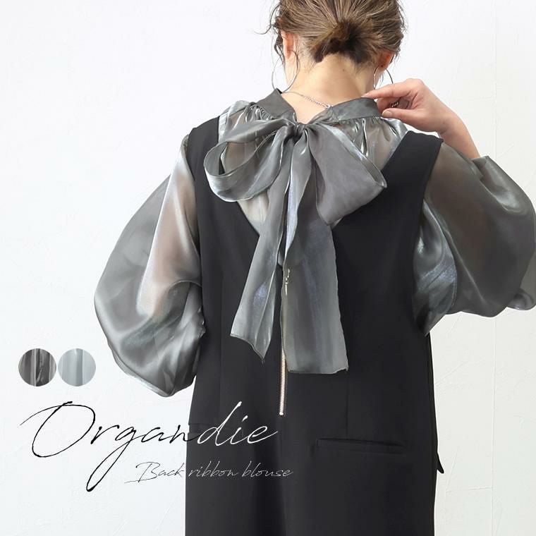 バックリボンオーガンジーブラウス 煌めく光沢感のあるオーガンジー生地で仕立てた後ろリボンブラウス。 お手持ちのボトムにシンプルに合わせるだけでぐっと華やかに。 また、ワンピースやサロペットのインに重ねても可愛く、トレンドムード 満点なスタイルが完成する旬アイテム。着こなしのポイントとなる 後ろリボンは結んだり、タイのように垂らしたり、お好みでアレンジが可能。 シンプルになりがちな大人コーデを表情豊かに魅せてくれる、主役ブラウスです。