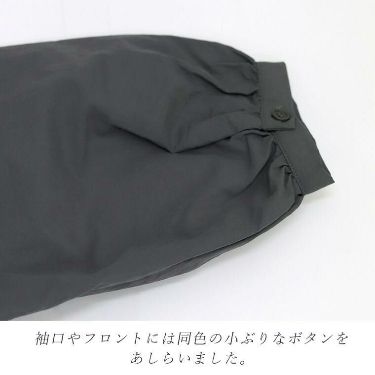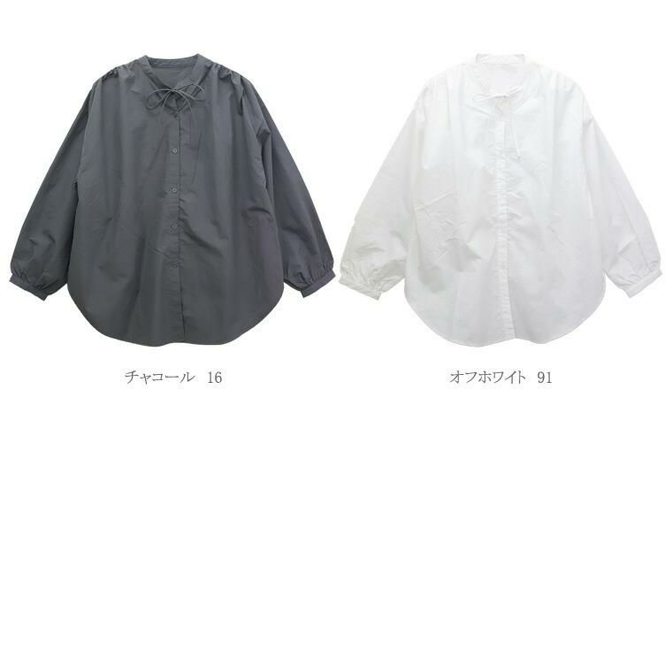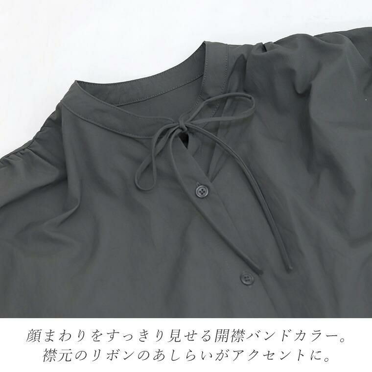 バンドカラーリボン使い後ろギャザーブラウス つよいハリ感で立体的なシルエットで着られるブラウス。 身体のラインを沿わないから体型カバーしつつ、こなれ感あるシルエットをキープします。 生地全体にはシワ加工が施されて、ノーアイロンで着用可能。 襟元の細リボンがスタイルのアクセントとなります。 後ろ・肩・袖口にはたっぷりギャザーを寄せてドレープ感をプラス。 ゆったりしたサイジングが魅力で、体型カバーしながらトレンドも楽しめるアイテムです。