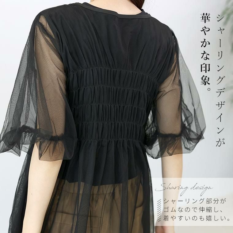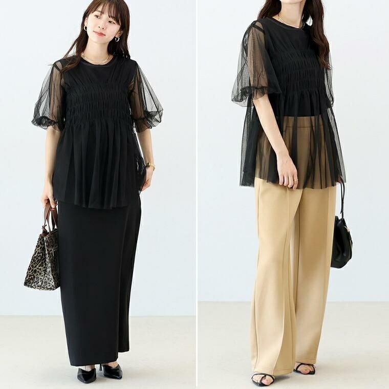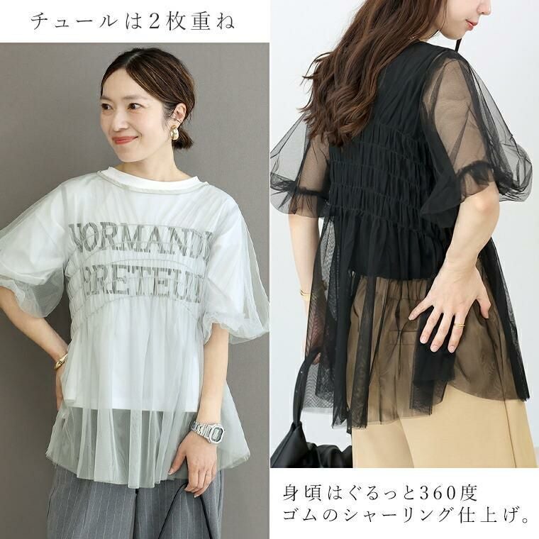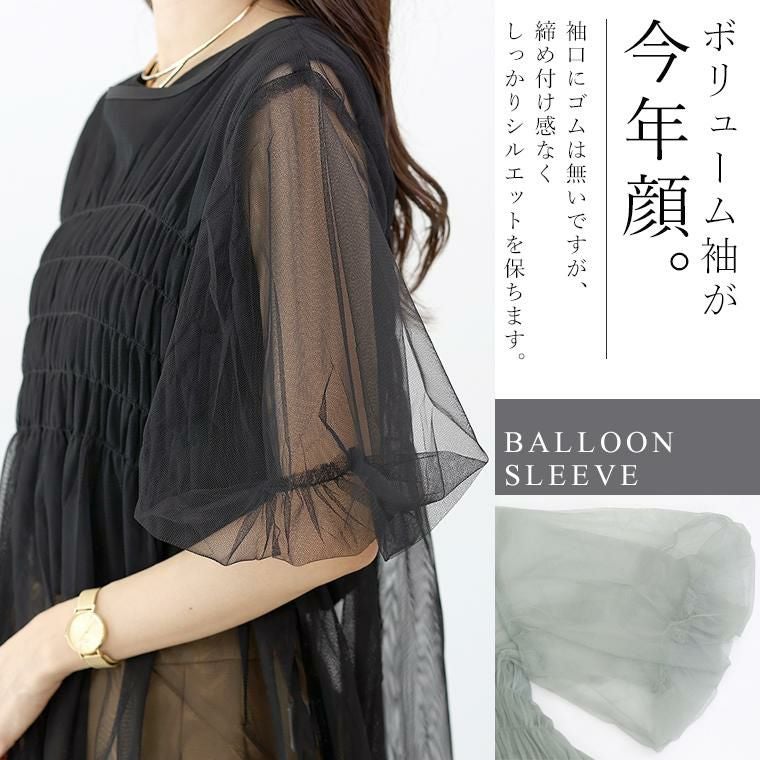 シャーリングデザインが華やかな印象。身頃のシャーリングはゴムなので伸縮し、着やすいのが嬉しい。袖にゴムは入っていませんが、バルーンシルエットでボリュームを保ち今年らしい一枚に。Aラインのフレアシルエットでお腹周りをさりげなくカバーします。身頃のチュールは2枚重ねにし、重なった部分が織りなす陰影が透明感を誘います。裾のチュールは切りっぱなしで軽い仕上がるになっています。コーデに取り入れるだけで即トレンド感のある装いに仕上がるアイテムです。