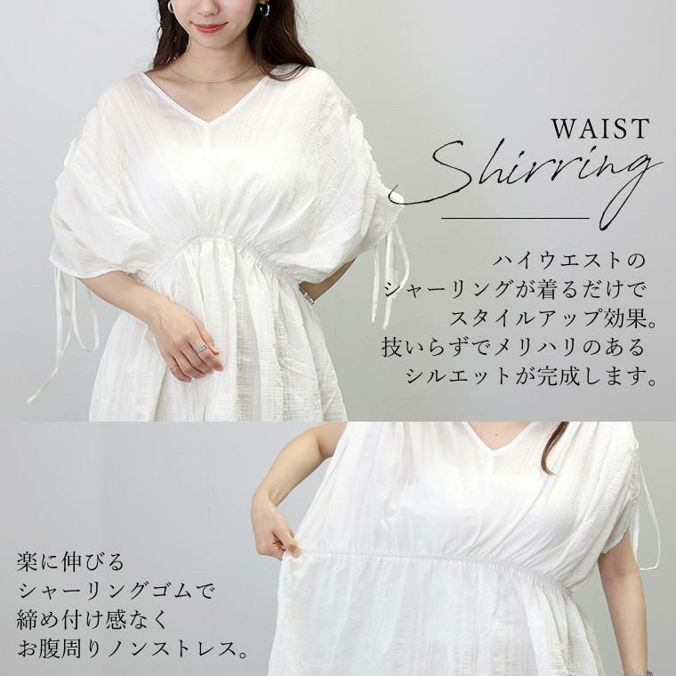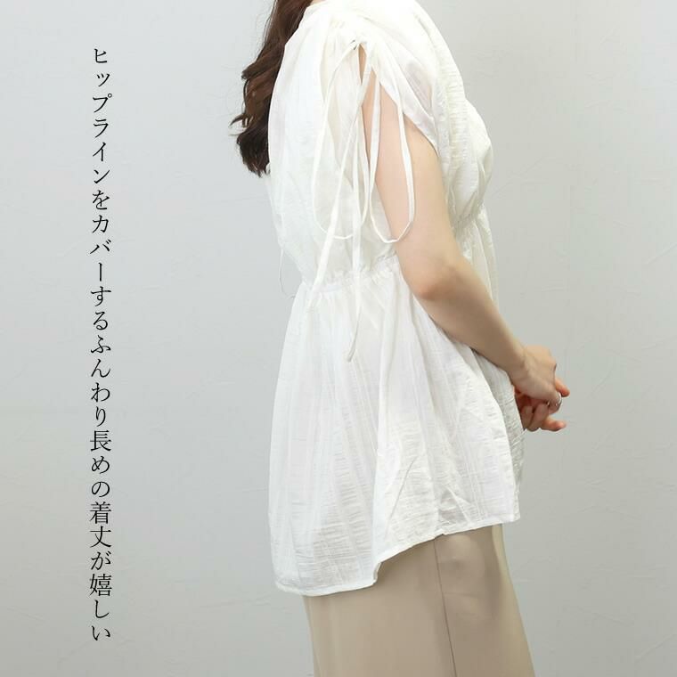 透け感あるシアーストライプ生地で仕立てたデザインブラウス。糸の太さに強弱をつけたランダムストライプのシワ感素材を採用。単色ながら着映える表面変化のある生地で大人っぽく着られます。薄手で軽く、涼しい着心地でこれからの季節におすすめです。一番のポイントは、袖丈をアレンジできる袖シャーリング。そのままエフォートレスな雰囲気で着るのはもちろん、シャーリングをグッと絞ればすっきりとしたノースリーブに。結んだ袖口の共布リボンもアクセントになります。さらにハイウエストのシャーリングはスタイルアップ効果も。襟元のVネックとXラインを描くシルエットが好相性です。袖のアレンジで着るたび新鮮、エアリーな主役ブラウスです。