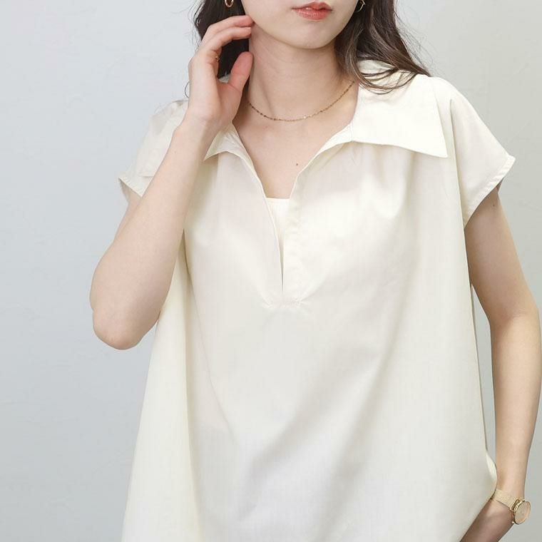 艶感のある平織生地で仕立てたフレンチブラウス。さらりとした軽い着心地です。肩をやさしく覆うフレンチスリーブで大人も一枚で着やすい。羽織りを重ねたときももたつきにくくジャケットのインに合わせればオフィスカジュアルにもおすすめです。大き目の襟は小顔に見せてくれる効果も。さらに深めに開いたスキッパー襟が顔周りをすっきり、上半身をコンパクトに見せます。パンツにもスカートにも合わせやすく、オンにもオフにも使える汎用性の高いアイテムです。