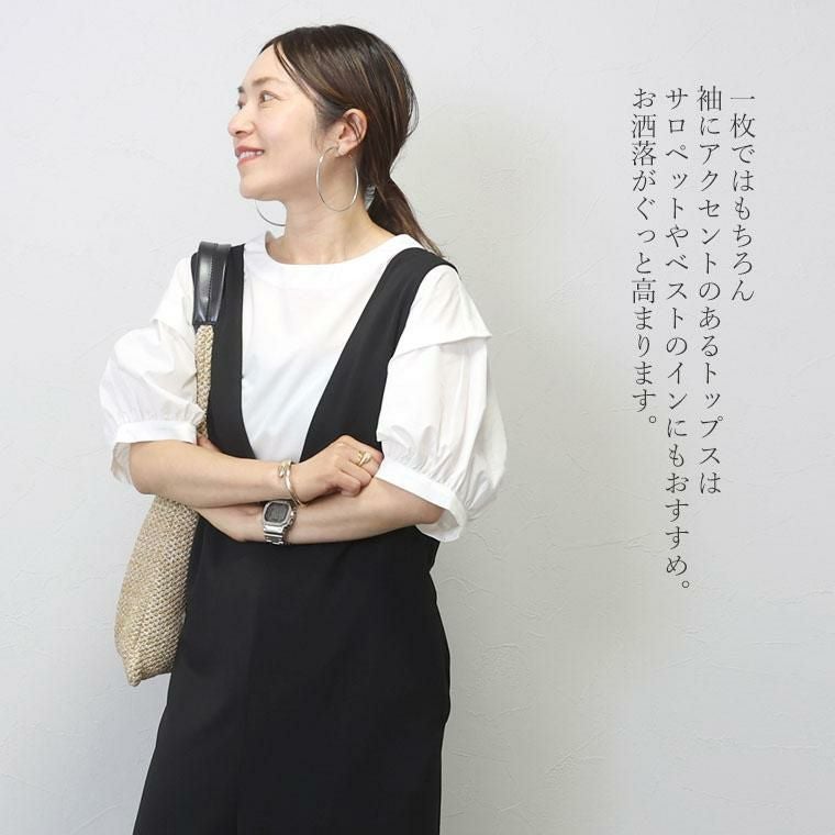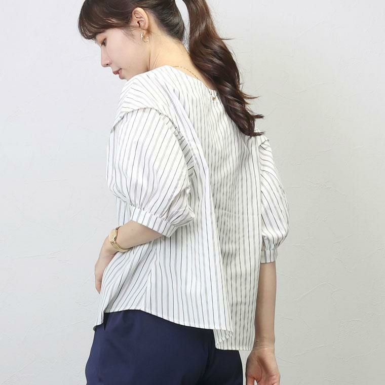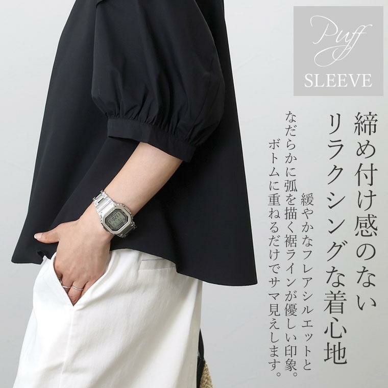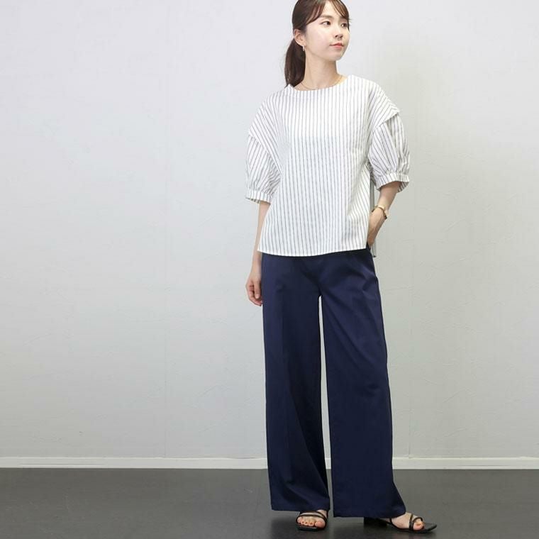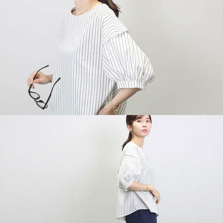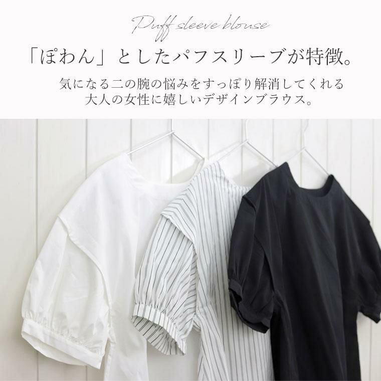 ぽわんとしたパフスリーブが特徴のプルオンブラウス。気になる二の腕の悩みをすっぽり解消してくれる大人の女性に嬉しいデザインです。立体的な袖の切替が旬なポイントになっています。生地はさらり軽い着心地のT/Cツイル素材。薄手ながらも程よいハリが体のラインに沿いづらく、ボディーラインをカモフラージュしてくれます。緩やかなフレアシルエットとなだらかに弧を描く裾のラインが優しい印象。ボトムにさっと重ねるだけでバランスが良い絶妙な丈感です。ベーシックな無地のモノトーンと、凛としたストライプ柄のコーデしやすいカラー展開も魅力です。